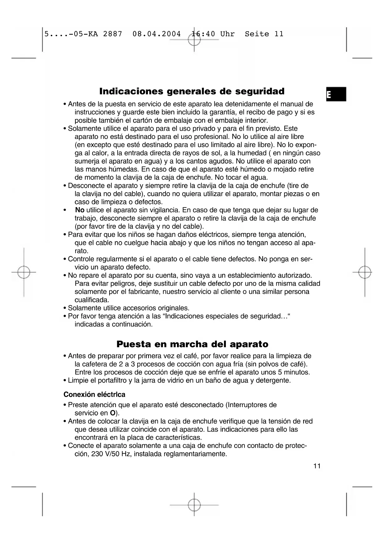 5....-05-KA 2887 08.04.2004 16:40 Uhr Seite 12Este aparato se ha examinado según las normativas actuales y vigentes de la Comunidad Europea, como p.ej. compatibilidad electromagnética y directiva de baja tensión y se ha construido según las más nuevas especificaciones en razón de la seguridad. No reservamos el derecho de efectuar modificaciones técnicas. Garantía Para el aparato comercializado por nosotros nos responsabilizamos con una garantía de 24 meses a partir de la fecha de compra (factura de compra). Durante el período de garantía nos encargamos gratuítamente de los defectos del aparato y de los accesorios*), que se hayan originado por defectos del material o de la fabricación. Dependiendo de nuestra estimación se realizará una reparación o un cambio. ¡Los servicios de garantía no prolangan la garantía, ni se incia por ello un período nuevo de garantía! Como comprobante para la garantía es válido la factura de compra. Sin este com- probante no se podrá realizar un cambio o una reparación gratuíta. En caso de garantía entregue el aparato completo en su embalaje original junto con la factura a su agente comerciante. *) Defectos en las piezas de accesorio, no significan automáticamente el recambio gratuito del aparato completo. ¡En este caso dirijase por favor a nuestra linea de atención al cliente! ¡Rotos de vidrio o roturas en las piezas de plástico deben pagarse siempre por el cliente ! Defectos en los accesorios de uso o en las piezas de desgaste (p.ej. escobillas de carbón del motor, varillas amasadoras, correas de transmisión, mando a distancia de repuesto, cepillos de dientes de repuesto, hojas de sierra etc.), como también la limpieza, mantenimiento o el recambio de piezas de desgaste no recaen en la garantía e irán al cargo del cliente! En caso de intervención ajena se expira la garantía. Después de la garantía Después de haber expirado la garantía se pueden realizar las reparaciones por el concesionario o por el servicio de reparaciones. Los gastos irán al cargo del cliente.