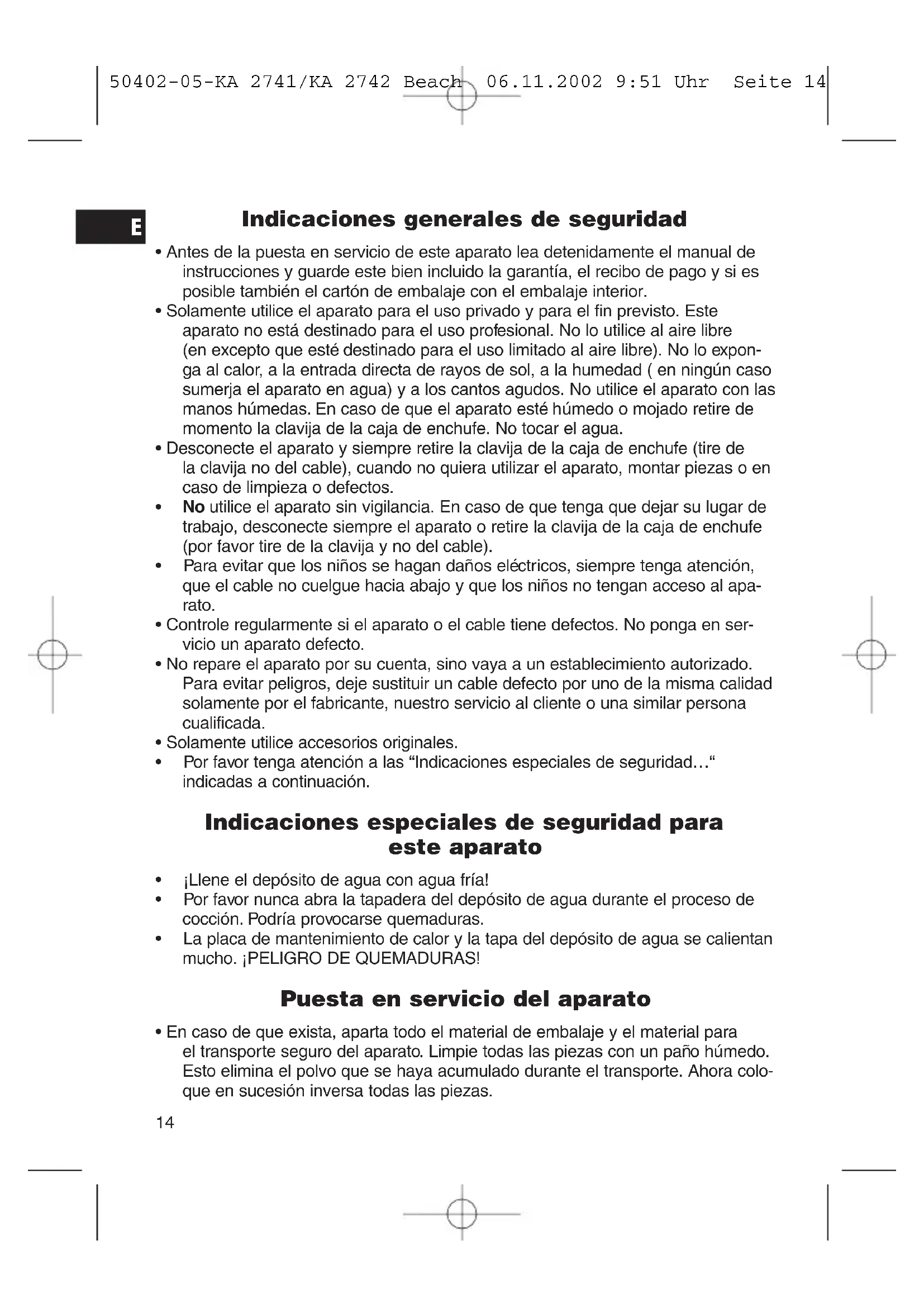 50402-05-KA 2741/KA 2742 Beach 06.11.2002 9:51 Uhr Seite 14• Antes de la primera cocción de café deje pasar para la limpieza de 2 a 3 pasos agua fría por el aparato. Conexión eléctrlca