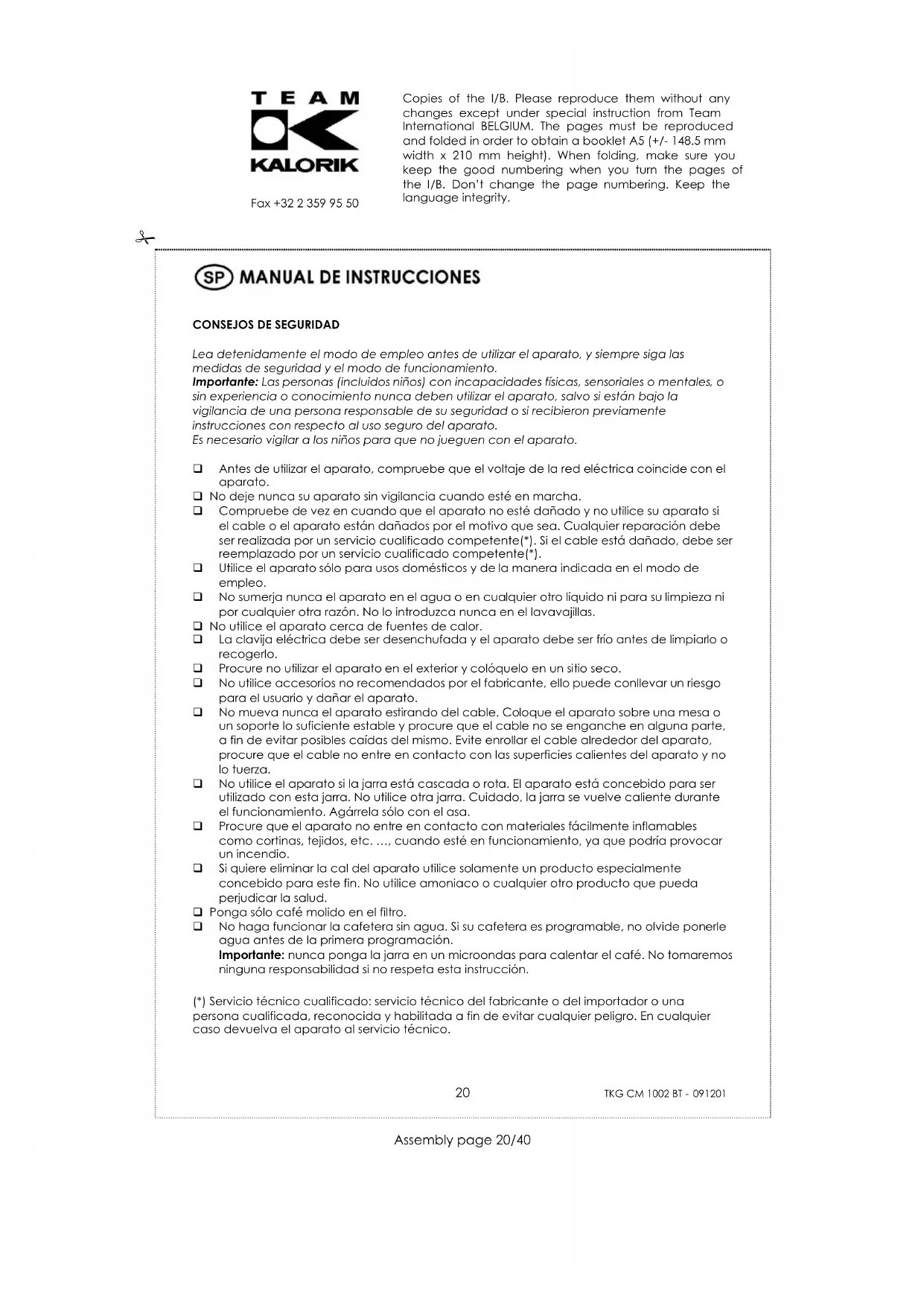Fax +32 2 359 95 50 Para limpiar la placa eléctrica, utilice una esponja no abrasiva a fin de no arañarla. Proceda de la misma manera para limpiar la jarra, pero añada un detergente clásico para aumentar su eficacia. CONSEJO Cuando empiece a notar que el café tarda en pasar más tiempo de lo habitual, decalcifique su aparato y no espere, sobre todo, a que la situación se agrave, con ello mantendrá más tiempo la vida de su aparato. El mantenimiento de su cafetera es importante para la duración de vida de su aparato. Tenga en cuenta que la garantía no cubre los deterioros causado por el mal uso, ni el recambio de la resistencia por estar cubierta de cal. PROTECCIÓN DEL MEDIO AMBIENTE – DIRECTIVA 2002/96/CE Para poder preservar nuestro medio ambiente y proteger la salud humana, los residuos eléctricos y equipos electrónicos deberían ser destruidos de acuerdo con unas normas especificas con la implicación de ambos proveedores y consumidores. Por esta razón, como indica el símbolo en la placa de datos técnicos, su aparato no debería ser tirado en un contenedor municipal sino que debería ser devuelto a la tienda, o dejado en un punto de recolección para ser reciclado o usado para otras aplicaciones conforme a la directiva. Copies of the I/B. Please reproduce them without any changes except under special instruction from Team International BELGIUM. The pages must be reproduced and folded in order to obtain a booklet A5 (+/- 148.5 mm width x 210 mm height). When folding, make sure you keep the good numbering when you turn the pages of the I/B. Don’t change the page numbering. Keep the language integrity.