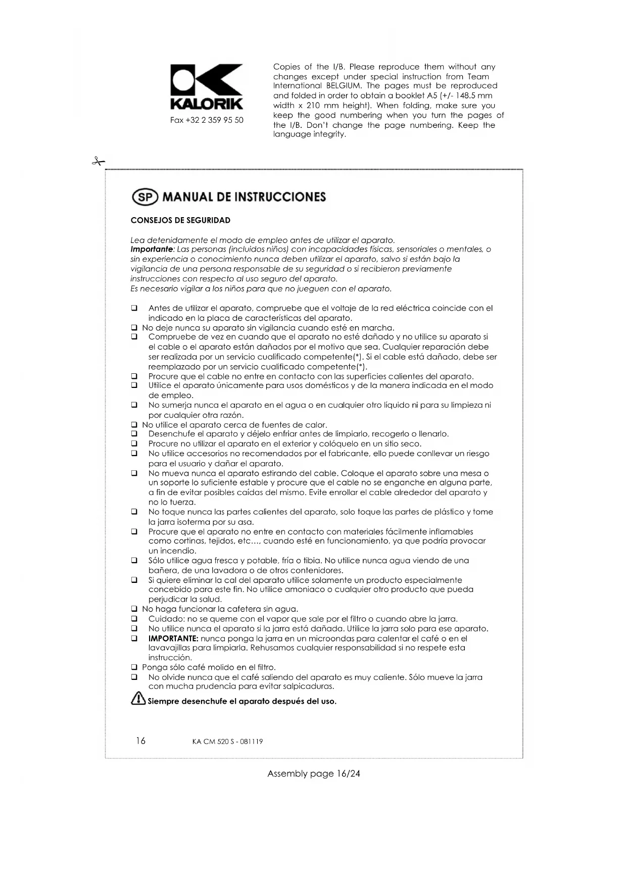 Cuando empiece a notar que el café tarda en pasar más tiempo de lo habitual, decalcifique su aparato y no espere, sobre todo, a que la situación se agrave. La frecuencia de desincrustación depende de la dureza del agua y varia entonces de una casa a otra. Es muy importante comprobar regularmente que no se forme cal en su cafetera. Le aconsejamos desincrustar su aparato con regularidad para conservar la cafetera en buen estado. Para ello, utilice un desincrustante para cafeteras eléctricas que venden en el mercado y siga sus instrucciones. Después enjuague el aparato con agua fresca, sin café molido. La garantía no cubre los aparatos que no hayan sido desincrustadas. No ponga nunca su aparato y sus accesorios en un lavavajillas. Sólo limpie la jarra con agua jabonosa. Utilice un paño ligeramente húmedo y no abrasivo para las partes de plástico. Copies of the I/B. Please reproduce them without any changes except under special instruction from Team International BELGIUM. The pages must be reproduced and folded in order to obtain a booklet A5 (+/- 148.5 mm width x 210 mm height). When folding, make sure you keep the good numbering when you turn the pages of the I/B. Don’t change the page numbering. Keep the language integrity. 18 KA CM 520 S - 081119
