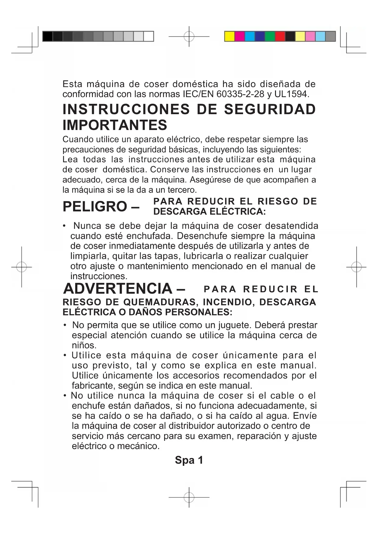 - No utilice nunca la máquina de coser si el cable o el enchufe están dañados, si no funciona adecuadamente, si se ha caído o se ha dañado, o si ha caído al agua. Envíe la máquina de coser al distribuidor autorizado o centro de servicio más cercano para su examen, reparación y ajuste eléctrico o mecánico.Spa 2