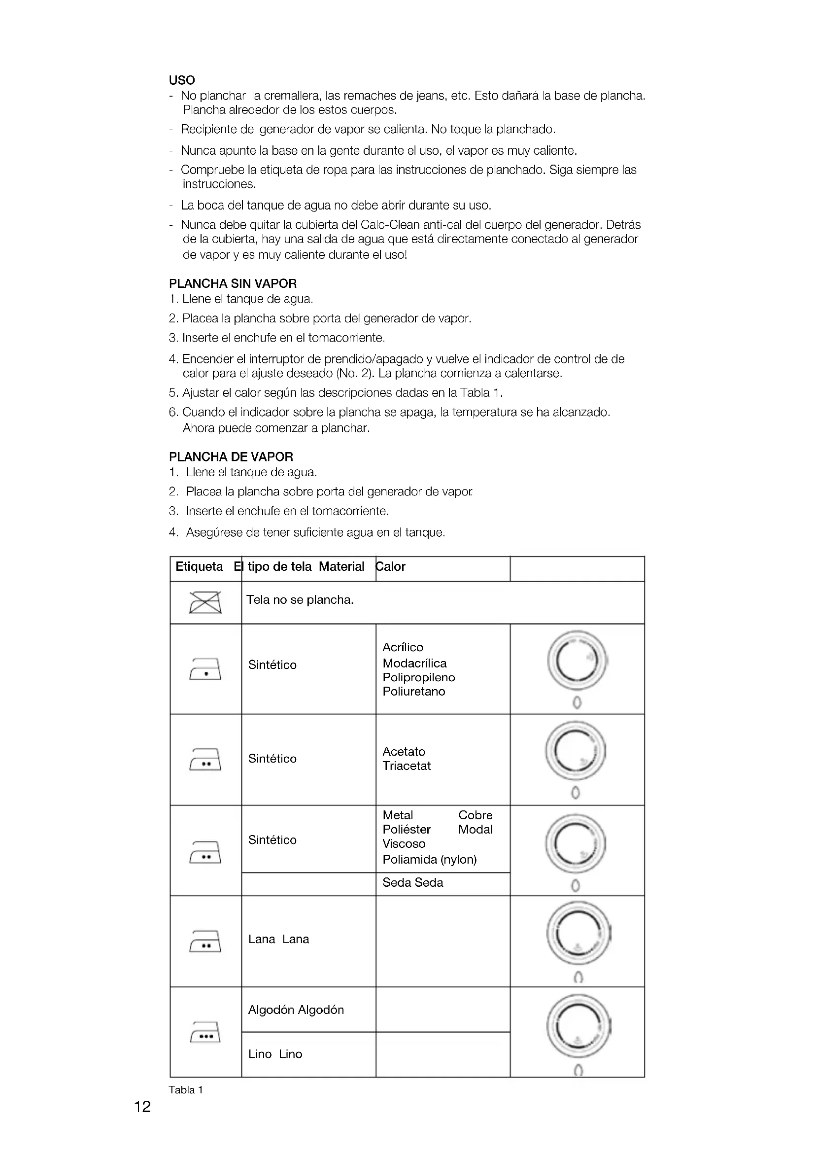 Asegúrese de tener suficiente agua en el tanque. Tela no se plancha. Sintético Acrílico Modacrílica Polipropileno Poliuretano Acetato Triacetat Seda Seda Metal Cobre Poliéster Modal
