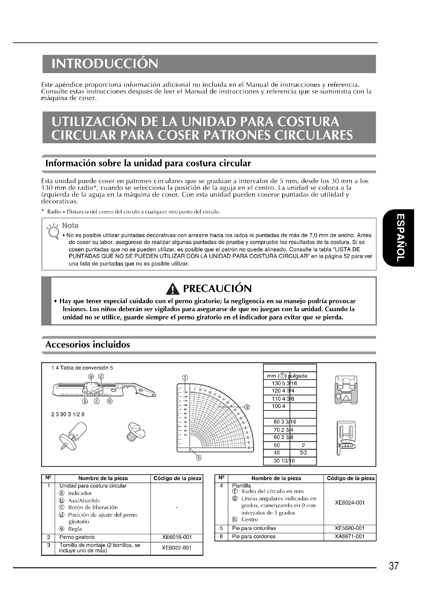- Hay que tener especial cuidado con el perno giratorio; la negligencia en su manejo podría provocar lesiones. Los niños deberán ser vigilados para asegurarse de que no juegan con la unidad. Cuando la unidad no se utilice, guarde siempre el perno giratorio en el indicador para evitar que se pierda.1 4 Tabla de conversión 5mm (f) pulgada130 5 3/16120 4 3/4110 4 3/8100 42 3 90 3 1/2 680 3 3/1670 2 3/460 2 3/850 240 3/230 13/16 Nombre de la pieza Código de la pieza1 Unidad para costura circulara Indicadorb Asa/Abatiblec Botón de liberaciónd Posición de ajuste del perno giratorioe Regla 2 Perno giratorio XE6016-0013 Tornillo de montaje (2 tornillos, se incluye uno de más)XE6022-0014 Plantillaf Radio del círculo en mmg Líneas angulares indicadas en grados, comenzando en 0 con intervalos de 5 gradosh CentroXE6024-0015 Pie para cinturillas XE5680-0016 Pie para cordones XA6871-001 Nombre de la pieza Código de la pieza38 Colocación de la unidad para costura circular