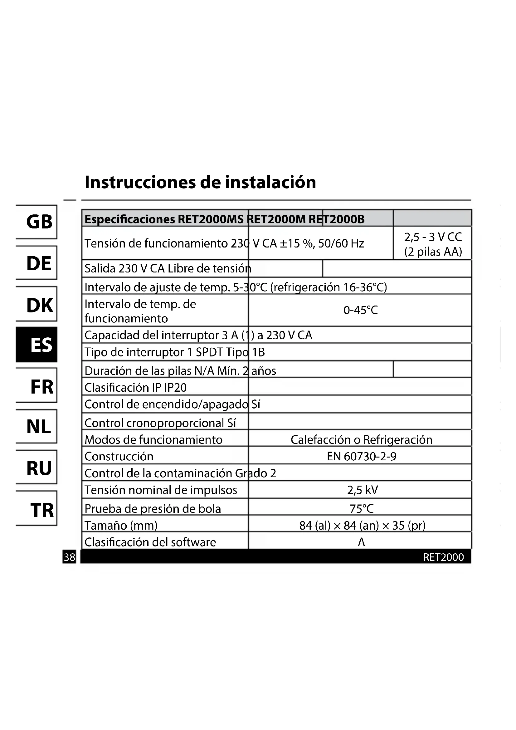 Especicaciones RET2000MS RET2000M RET2000B Tensión de funcionamiento 230VCA ±15%, 50/60Hz 2,5 - 3VCC (2 pilas AA) Salida 230VCA Libre de tensión Intervalo de ajuste de temp. 5-30°C (refrigeración 16-36°C) Intervalo de temp. de funcionamiento 0-45°C Capacidad del interruptor 3A (1) a 230VCA Tipo de interruptor 1 SPDT Tipo 1B Duración de las pilas N/A Mín. 2 años Clasicación IP IP20 Control de encendido/apagado Sí Control cronoproporcional Sí Modos de funcionamiento Calefacción o Refrigeración Construcción EN 60730-2-9 Control de la contaminación Grado 2 Tensión nominal de impulsos 2,5kV Prueba de presión de bola 75°C Tamaño (mm) 84 (al)×84 (an)×35 (pr) Clasicación del software A Instrucciones de instalaciónDanfoss Heating