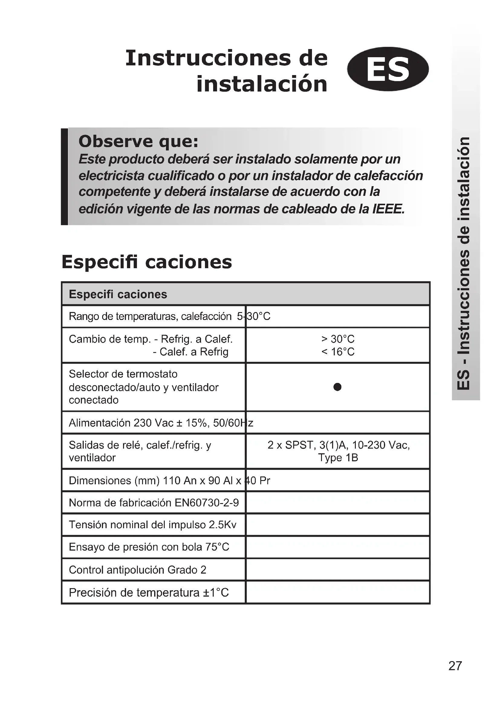 ES - Instrucciones de instalación Especifi cacionesRango de temperaturas, calefacción 5-30°CCambio de temp. - Refrig. a Calef. - Calef. a Refrig> 30°C< 16°CSelector de termostato desconectado/auto y ventilador conectado Alimentación 230 Vac ± 15%, 50/60HzSalidas de relé, calef./refrig. y ventilador2 x SPST, 3(1)A, 10-230 Vac, Type 1BDimensiones (mm) 110 An x 90 Al x 40 PrNorma de fabricación EN60730-2-9Tensión nominal del impulso 2.5KvEnsayo de presión con bola 75°CControl antipolución Grado 2Precisión de temperatura ±1°C Especifi caciones28 ES - Instrucciones de instalación Generalidades sobre el producto El termostato ha sido diseñado para ser utilizado en sistemas provistos de fan-coil servidos por un sistema central de cambio de 2 tuberías. El termostato controla el funcionamiento de una válvula motorizada que, durante los períodos de calefacción, se abre cuando se requiere calor y que, durante los períodos de refrigeración, se abre cuando se requiere refrigeración. Este cambio de calefacción a refrigeración se consigue automáticamente midiendo la temperatura de la tubería de impulsión. Si la temperatura de impulsión excede de 30°C, el termostato funciona como uno de calefacción, si la temperatura de impulsión es inferior a 16°C, el termostato funciona como uno de refrigeración. Nota importante: Es esencial que el circuito en que se encuentra el sensor de tubería no esté desconectado y que el agua circule continuamente después del sensor. Esto puede requerir la instalación de una válvula de derivación entre el fl ujo y el retorno del sistema al fi nal de cada circuito. Instalación En primer lugar, quitar la placa mural de la parte trasera de la unidad Debe haber un espacio libre de al menos 50mm arriba y de 100mm abajo con el fi n de montar el módulo enchufable. !29 Montarlo a una altura de aproximadamente 1,5 m desde el suelo, lejos de corrientes de aire o de fuentes de calor tales como radiadores, fuegos descubiertos o rayos solares directos. Situación del sensor de tubería Fije el sensor de tubería a la tubería de impulsión utilizando la banda de unión que se suministra.Nota importante: Es esencial que el circuito en que se encuentra el sensor de tubería no esté desconectado y que el agua circule continuamente después del sensor. Esto puede requerir la instalación de una válvula de derivación entre el fl ujo y el retorno del sistema al fi nal de cada circuito.