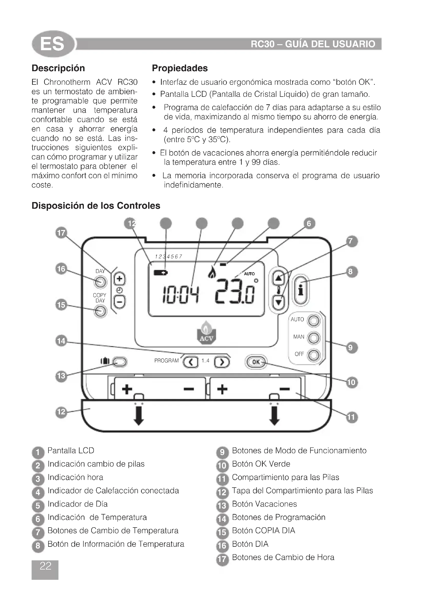 El Chronotherm ACV RC30 es un termostato de ambiente programable que permitemantener una temperaturacomfortable cuando se está en casa y ahora energia cuando no se está. Las instrucciones seguides explican como programar y utilizar el termostato para Obtener el mayorcoste.