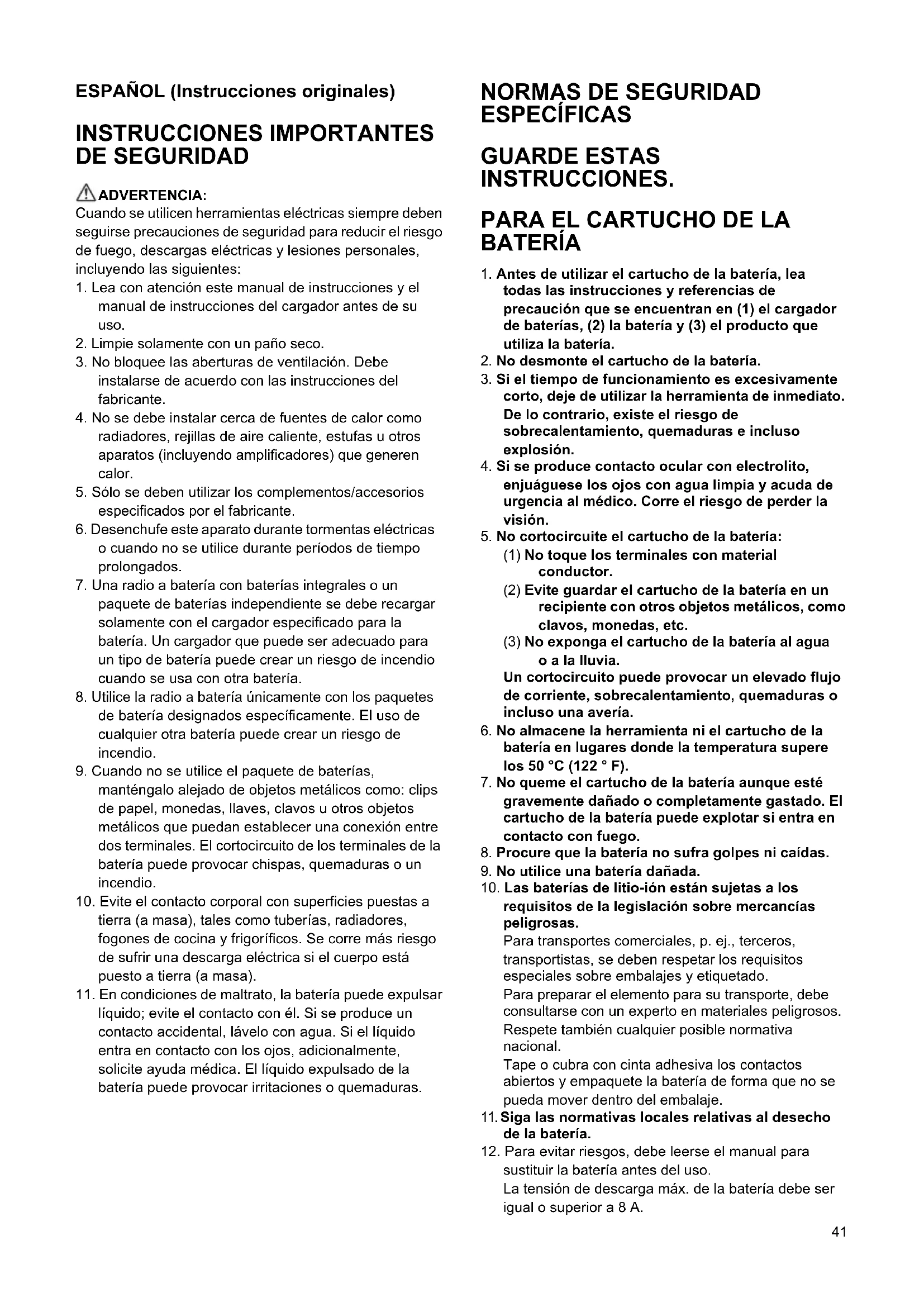 sustituir la batería antes del uso. La tensión de descarga máx. de la batería debe ser igual o superior a 8 A.42 PRECAUCIÓN: