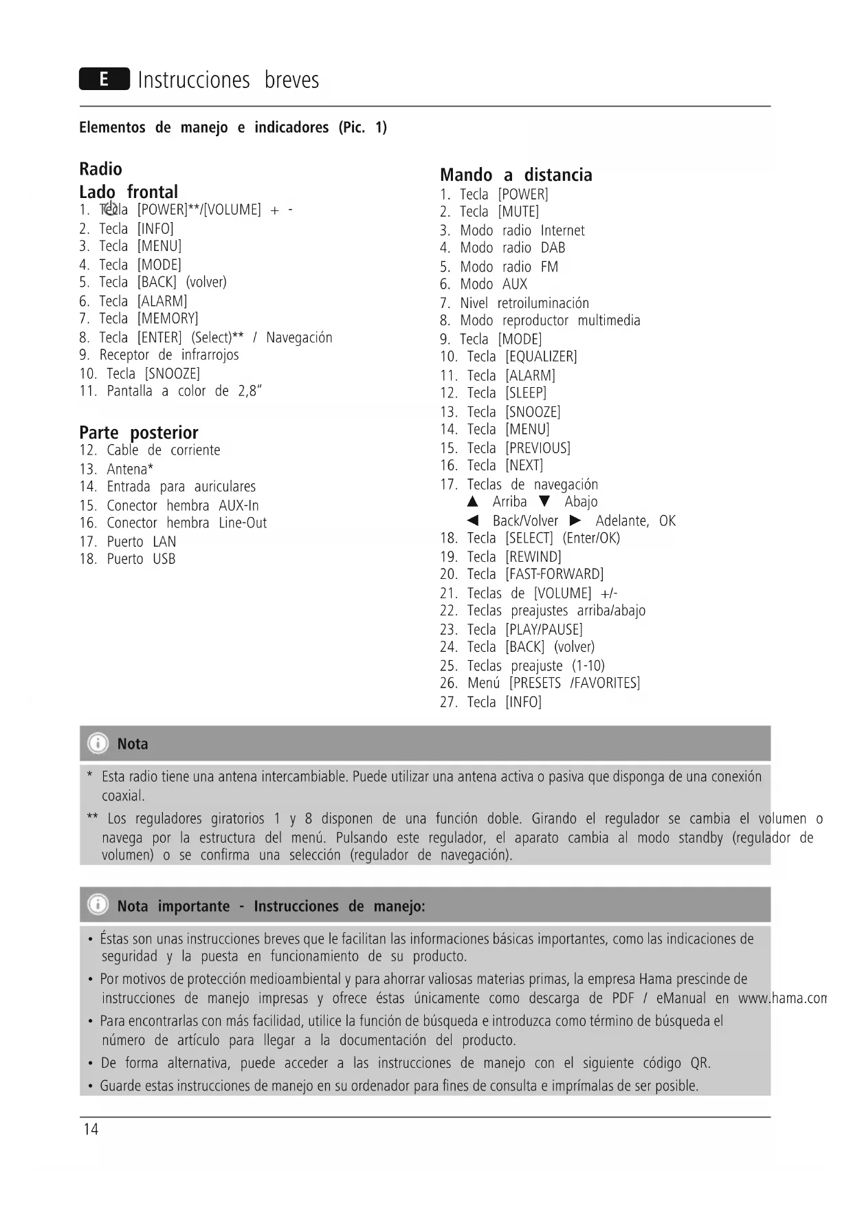 - Esta radio tiene una antena intercambiable. Puede utilizar una antena activa o pasiva que disponga de una conexión coaxial. ** Los reguladores giratorios 1 y 8 disponen de una función doble. Girando el regulador se cambia el volumen o se navega por la estructura del menú. Pulsando este regulador, el aparato cambia al modo standby (regulador de volumen) o se conrma una selección (regulador de navegación). Nota importante - Instrucciones de manejo: