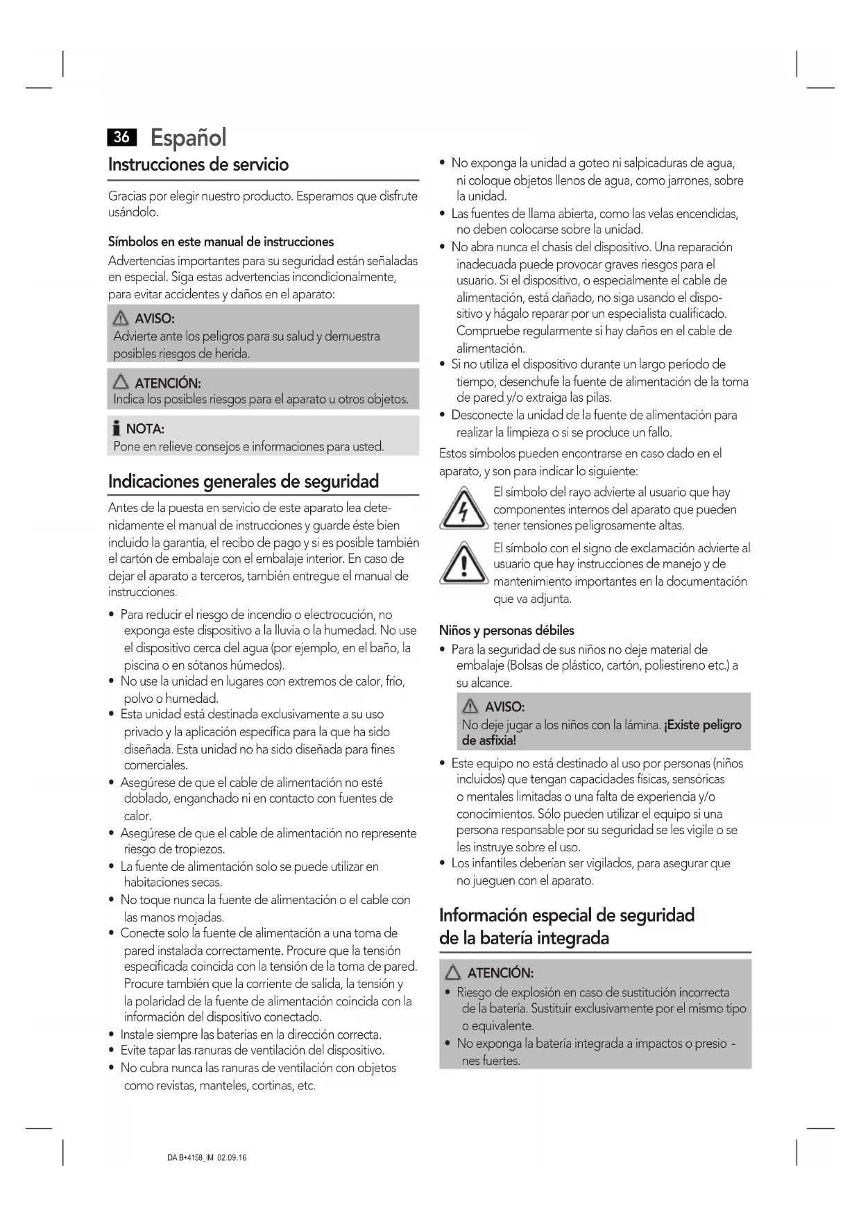 mination des appareils auprès de votre commune ou de l’administration de votre communauté. Mise au rebut des batteries L’appareil comprend une batterie rechargeable. Les batteries usées ne doivent pas être jetées à la poubelle. La batterie doit être retirée avant que le produit ne soit mis au rebut. Pour ce faire, contactez un spécialiste qualifié. Les informations concernant le lieu où vous en débarrasser peuvent être trouvées via votre municipalité ou les autorités locales.36 Español DA B+4158_IM 02.09.16 Instrucciones de servicio Gracias por elegir nuestro producto. Esperamos que disfrute usándolo. Símbolos en este manual de instrucciones Advertencias importantes para su seguridad están señaladas en especial. Siga estas advertencias incondicionalmente, para evitar accidentes y daños en el aparato: AVISO: Advierte ante los peligros para su salud y demuestra posibles riesgos de herida. ATENCIÓN: Indica los posibles riesgos para el aparato u otros objetos. NOTA: Pone en relieve consejos e informaciones para usted. Indicaciones generales de seguridad Antes de la puesta en servicio de este aparato lea dete- nidamente el manual de instrucciones y guarde éste bien incluido la garantía, el recibo de pago y si es posible también el cartón de embalaje con el embalaje interior. En caso de dejar el aparato a terceros, también entregue el manual de instrucciones.
