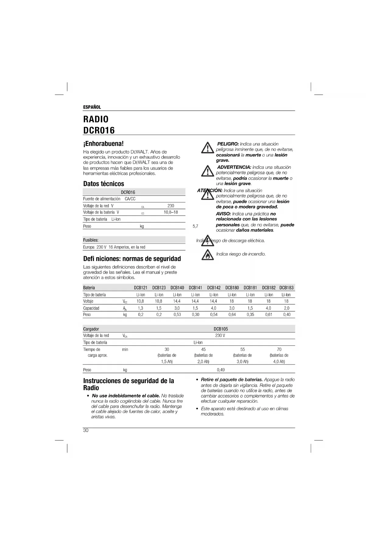 10,8–18 Tipo de batería Li-Ion Peso kg 5,7 Fusibles: Europa 230V 16 Amperios, en la red Defi niciones: normas de seguridad Las siguientes definiciones describen el nivel de gravedad de las señales. Lea el manual y preste atención a estos símbolos. PELIGRO: Indica una situación peligrosa inminente que, de no evitarse, ocasionará la muerte o una lesión grave. ADVERTENCIA: Indica una situación potencialmente peligrosa que, de no evitarse, podría ocasionar la muerte o una lesión grave. ATENCIÓN: Indica una situación potencialmente peligrosa que, de no evitarse, puede ocasionar una lesión de poca o modera gravedad. AVISO: Indica una práctica no relacionada con las lesiones personales que, de no evitarse, puede ocasionar daños materiales. Indica riesgo de descarga eléctrica. Indica riesgo de incendio. Batería DCB121 DCB123 DCB140 DCB141 DCB142 DCB180 DCB181 DCB182 DCB183 Tipo de batería Li-Ion Li-Ion Li-Ion Li-Ion Li-Ion Li-Ion Li-Ion Li-Ion Li-Ion Voltaje V