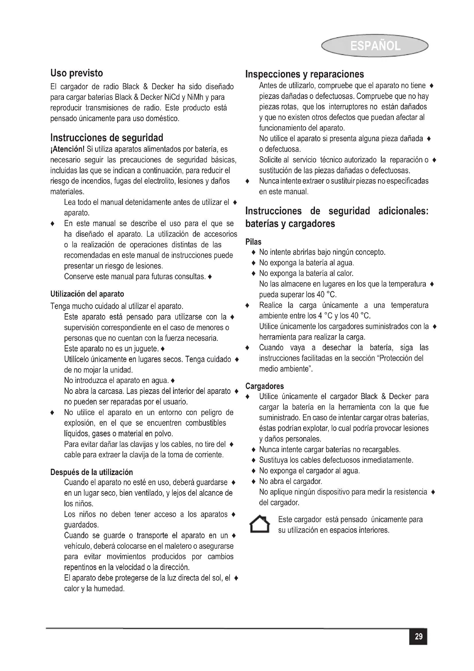 Descarga las instrucciones para tu Radio en formato PDF gratis! Encuentra tus instrucciones BD18RC T1 - BLACK & DECKER y toma tu dispositivo electrónico nuevamente en la mano. En esta página están publicados todos los documentos necesarios para el uso de su dispositivo. BD18RC T1 de la marca BLACK & DECKER.