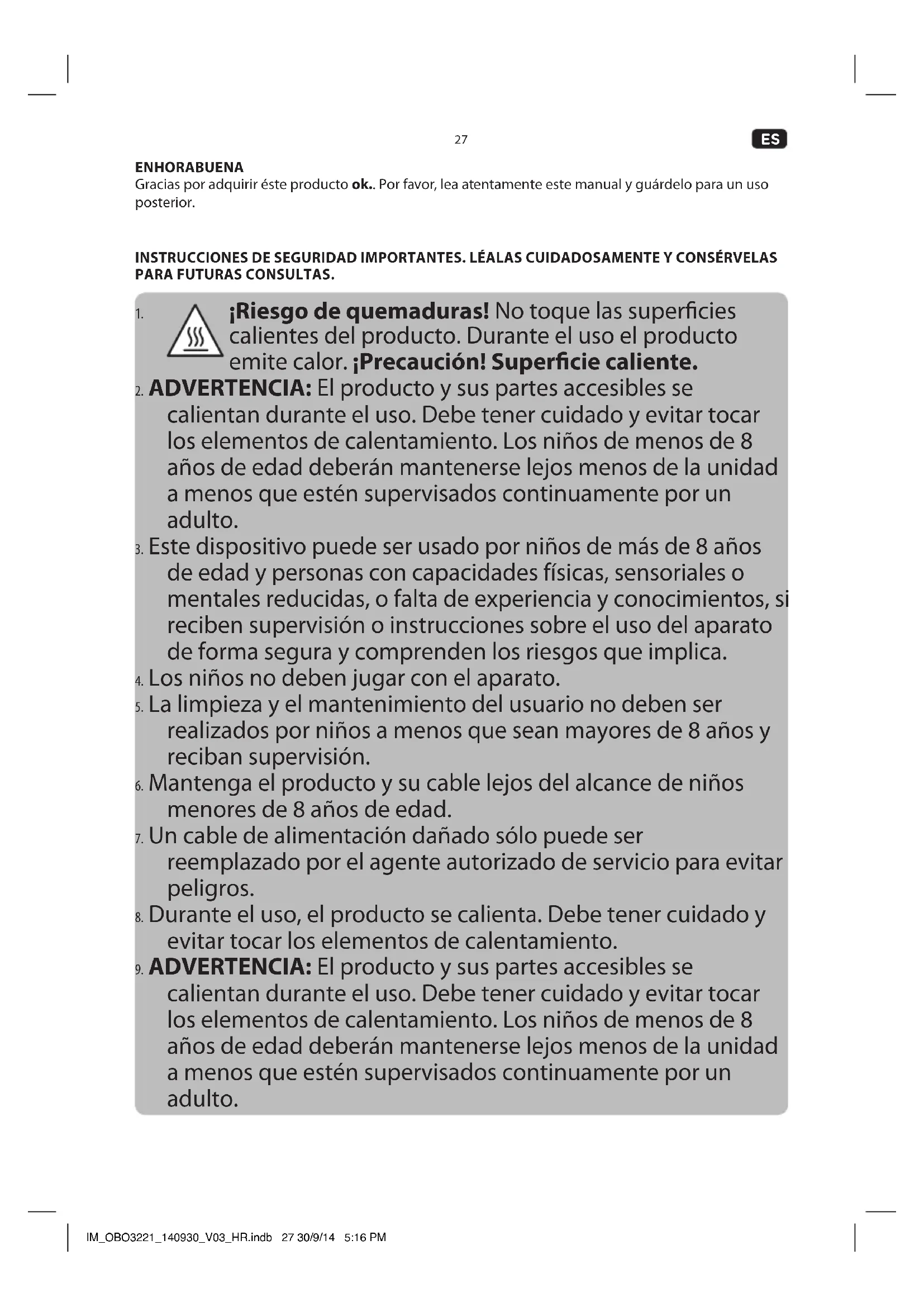 calientan durante el uso. Debe tener cuidado y evitar tocar los elementos de calentamiento. Los niños de menos de 8 años de edad deberán mantenerse lejos menos de la unidad a menos que estén supervisados continuamente por un adulto. IM_OBO3221_140930_V03_HR.indb 27 30/9/14 5:16 PM28