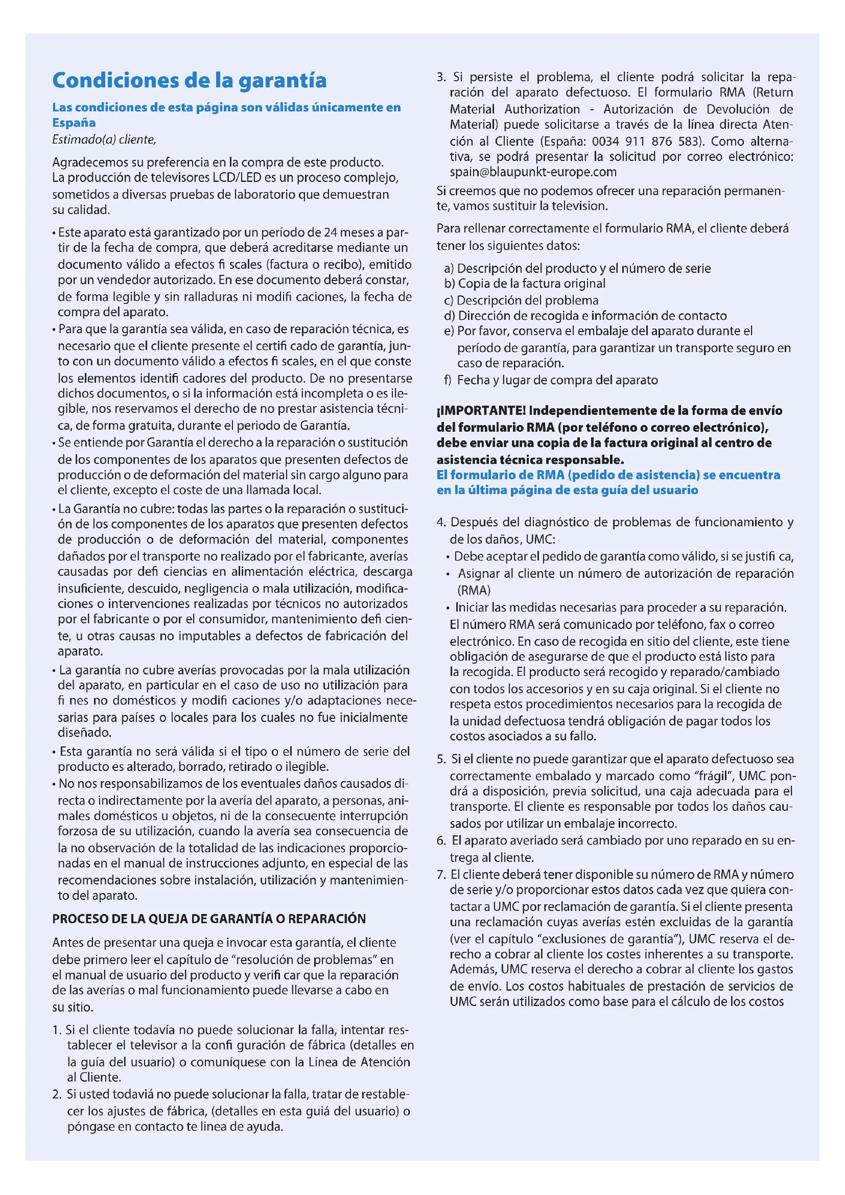 Si persistsé el problema, el clienteouldra solicitar la reparación del aparato defectuoso. El formulario RMA (Return Material Authorization - Autorización de Devolución de Material) pueda Solicitarse atraves de la linea directa Atencion al Cliente (Espana: 0034 911 876 583). Como alternativa, seouldra presentar la solicitud por correo electrónico: spain@blaupunkt-europe.com