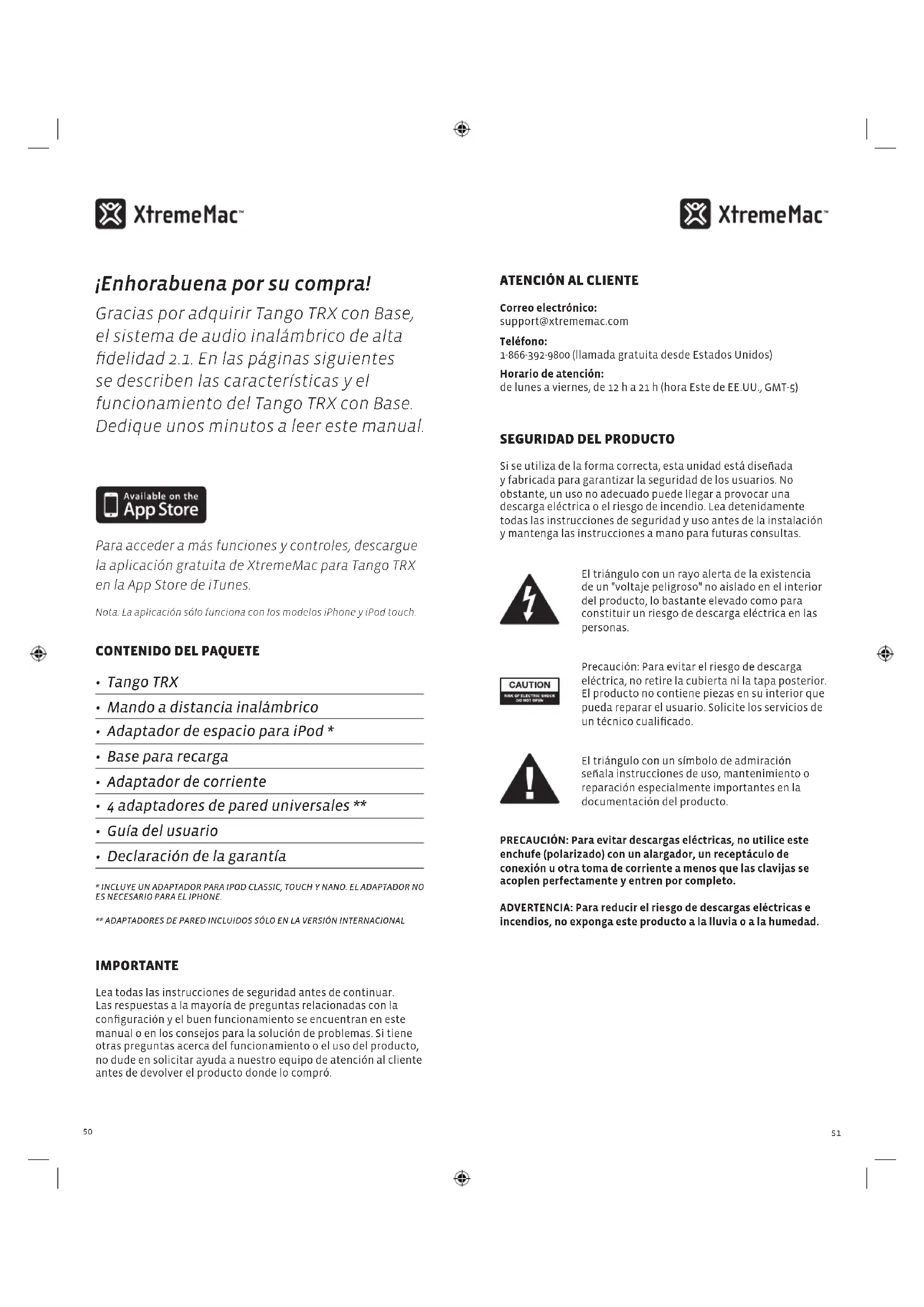 - INCLUYE UN ADAPTADOR PARA IPOD CLASSIC, TOUCH Y NANO. EL ADAPTADOR NO ES NECESARIO PARA EL IPHONE.** ADAPTADORES DE PARED INCLUIDOS SÓLO EN LA VERSIÓN INTERNACIONAL ImPortante Lea todas las instrucciones de seguridad antes de continuar. Las respuestas a la mayoría de preguntas relacionadas con la configuración y el buen funcionamiento se encuentran en este manual o en los consejos para la solución de problemas. Si tiene otras preguntas acerca del funcionamiento o el uso del producto, no dude en solicitar ayuda a nuestro equipo de atención al cliente antes de devolver el producto donde lo compró. atencIón al clIente Correo electrónico: support@xtrememac.com Teléfono: 1-866-392-9800 (llamada gratuita desde Estados Unidos) Horario de atención: de lunes a viernes, de 12 h a 21 h (hora Este de EE.UU., GMT-5) segurIDaD Del ProDucto Si se utiliza de la forma correcta, esta unidad está diseñada y fabricada para garantizar la seguridad de los usuarios. No obstante, un uso no adecuado puede llegar a provocar una descarga eléctrica o el riesgo de incendio. Lea detenidamente todas las instrucciones de seguridad y uso antes de la instalación y mantenga las instrucciones a mano para futuras consultas. El triángulo con un rayo alerta de la existencia de un "voltaje peligroso" no aislado en el interior del producto, lo bastante elevado como para constituir un riesgo de descarga eléctrica en las personas. Precaución: Para evitar el riesgo de descarga eléctrica, no retire la cubierta ni la tapa posterior. El producto no contiene piezas en su interior que pueda reparar el usuario. Solicite los servicios de un técnico cualificado. El triángulo con un símbolo de admiración señala instrucciones de uso, mantenimiento o reparación especialmente importantes en la documentación del producto. PRECAUCIÓN: Para evitar descargas eléctricas, no utilice este enchufe (polarizado) con un alargador, un receptáculo de conexión u otra toma de corriente a menos que las clavijas se acoplen perfectamente y entren por completo. ADVERTENCIA: Para reducir el riesgo de descargas eléctricas e incendios, no exponga este producto a la lluvia o a la humedad.52