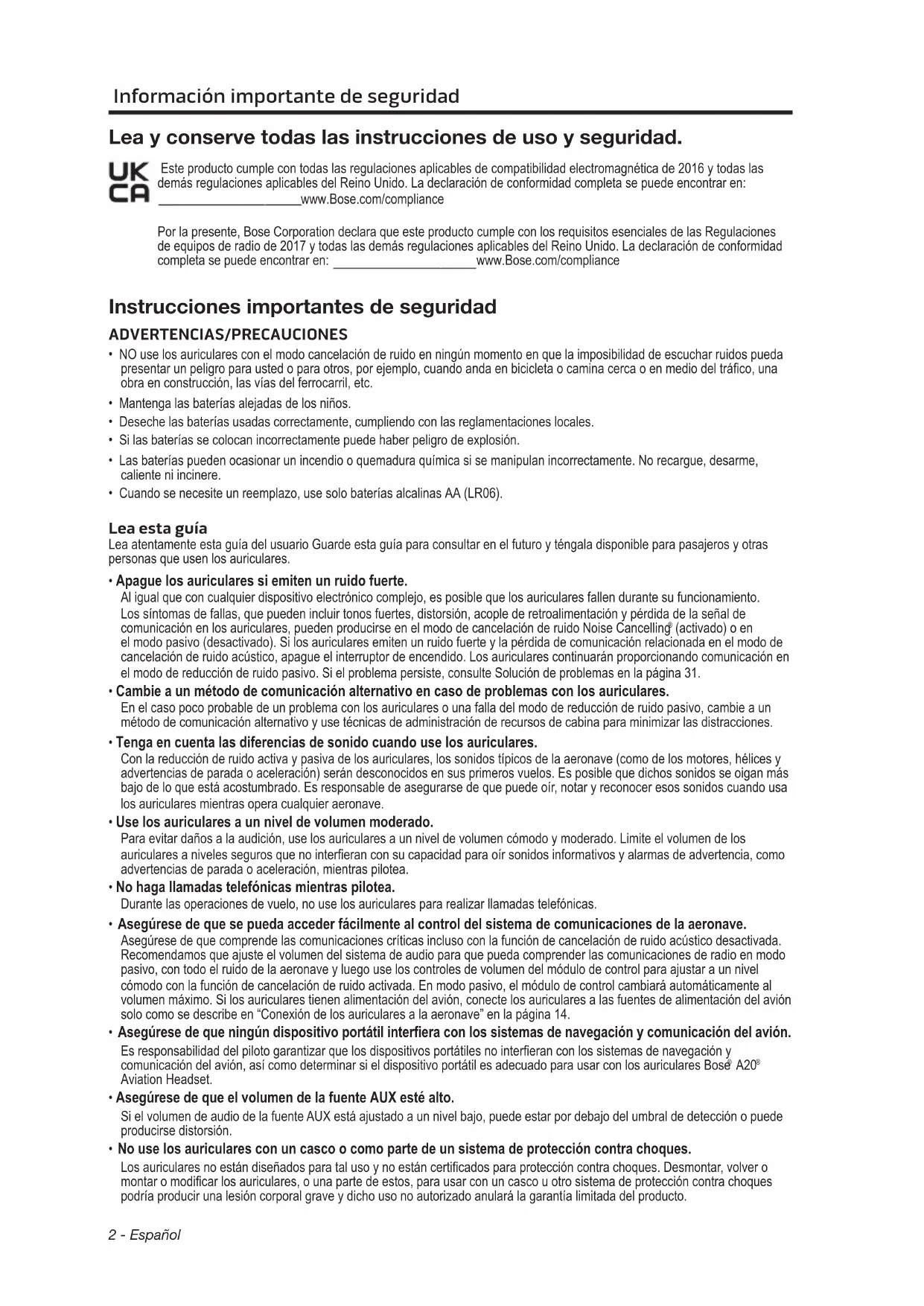 Lea y conserve todas las instrucciones de uso y seguridad. Este producto cumple con todas las regulaciones aplicables de compatibilidad electromagnética de 2016 y todas las demás regulaciones aplicables del Reino Unido. La declaración de conformidad completa se puede encontrar en: www.Bose.com/compliancewww.Bose.com/compliance Por la presente, Bose Corporation declara que este producto cumple con los requisitos esenciales de las Regulaciones de equipos de radio de 2017 y todas las demás regulaciones aplicables del Reino Unido. La declaración de conformidad completa se puede encontrar en: www.Bose.com/compliancewww.Bose.com/compliance Instrucciones importantes de seguridad ADVERTENCIAS/PRECAUCIONES