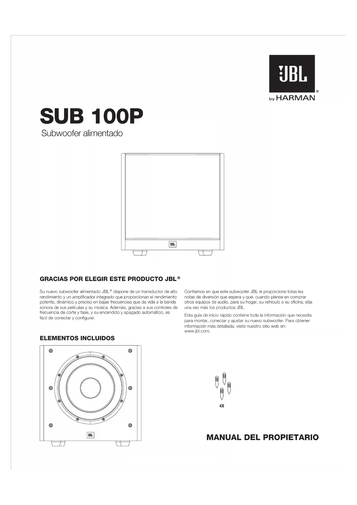 dispone de un transductor de alto rendimiento y un amplificador integrado que proporcionan el rendimiento potente, dinámico y preciso en bajas frecuencias que da vida a la banda sonora de sus películas y su música. Además, gracias a sus controles de frecuencia de corte y fase, y su encendido y apagado automático, es fácil de conectar y configurar. Confiamos en que este subwoofer JBL le proporcione totas las notas de diversión que espera y que, cuando piense en comprar otros equipos de audio, para su hogar, su vehículo o su oficina, elija una vez más los productos JBL. Esta guía de inicio rápido contiene toda la información que necesita para montar, conectar y ajustar su nuevo subwoofer. Para obtener información más detallada, visite nuestro sitio web en: www.jbl.com. Subwoofer alimentado
