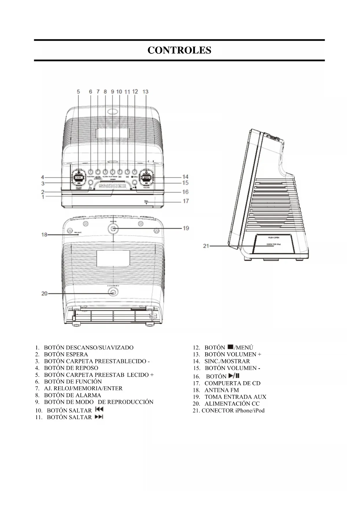El temporizador de reposo apaga automáticamente el dispositivo cuando haya transcurrido el tiempo preestablecido. Dispone de 5 periodos de tiempo disponibles:120, 90, 60, 30 y 15 minutos. Pulse repetidamente el botón REPOSO para seleccionar el tiempo de reposo deseado. Aparecerá “REPOSO” y el tiempo seleccionado en pantalla. Pasados unos segundos se mostrará la pantalla original y “REPOSO” permanecerá encendido. Para anular el temporizador de reposo durante el funcionamiento Pulse el botón “REPOSO” repetidamente hasta que aparezca “APAGADO” en pantalla. El temporizador también se anula si se apaga la alimentación.ESPECIFICACIONES Sintonizador Frecuencia de recepción: FM: 87.5-108 MHz Reproductor de CD Tipo: Estéreo de 2 canales Respuesta de frecuencia: 20Hz -20KHz General Salida: ALTAVOCES: 8 ohm Requisitos de alimentación: CA 100-230V 50Hz. Dimensiones: 139(L) x 150(A) x 128(P) mm Peso: Aprox. 0,69kgCONTROLOS