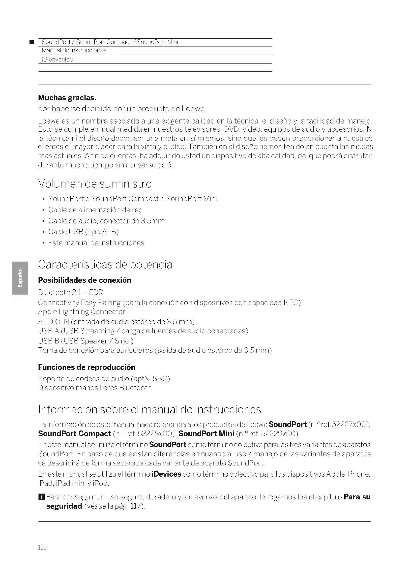 - Este manual de instrucciones Características de potencia Posibilidades de conexión Bluetooth 2.1 + EDR Connectivity Easy Pairing (para la conexión con dispositivos con capacidad NFC) Apple Lightning Connector AUDIO IN (entrada de audio estéreo de 3,5 mm) USB A (USB Streaming / carga de fuentes de audio conectadas) USB B (USB Speaker / Sinc.) Toma de conexión para auriculares (salida de audio estéreo de 3,5 mm) Funciones de reproducción Soporte de codecs de audio (aptX, SBC) Dispositivo manos libres Bluetooth Información sobre el manual de instrucciones La información de este manual hace referencia a los productos de Loewe SoundPort (n.º ref. 52227x00), SoundPort Compact (n.º ref. 52228x00), SoundPort Mini (n.º ref. 52229x00). En este manual se utiliza el término SoundPort como término colectivo para las tres variantes de aparatos SoundPort. En caso de que existan diferencias en cuando al uso / manejo de las variantes de aparatos, se describirá de forma separada cada variante de aparato SoundPort. En este manual se utiliza el término iDevices como término colectivo para los dispositivos Apple iPhone, iPad, iPad mini y iPod. Para conseguir un uso seguro, duradero y sin averías del aparato, le rogamos lea el capítulo Para su seguridad (véase la pág. 117).SoundPort / SoundPort Compact / SoundPort Mini Manual de instrucciones Español