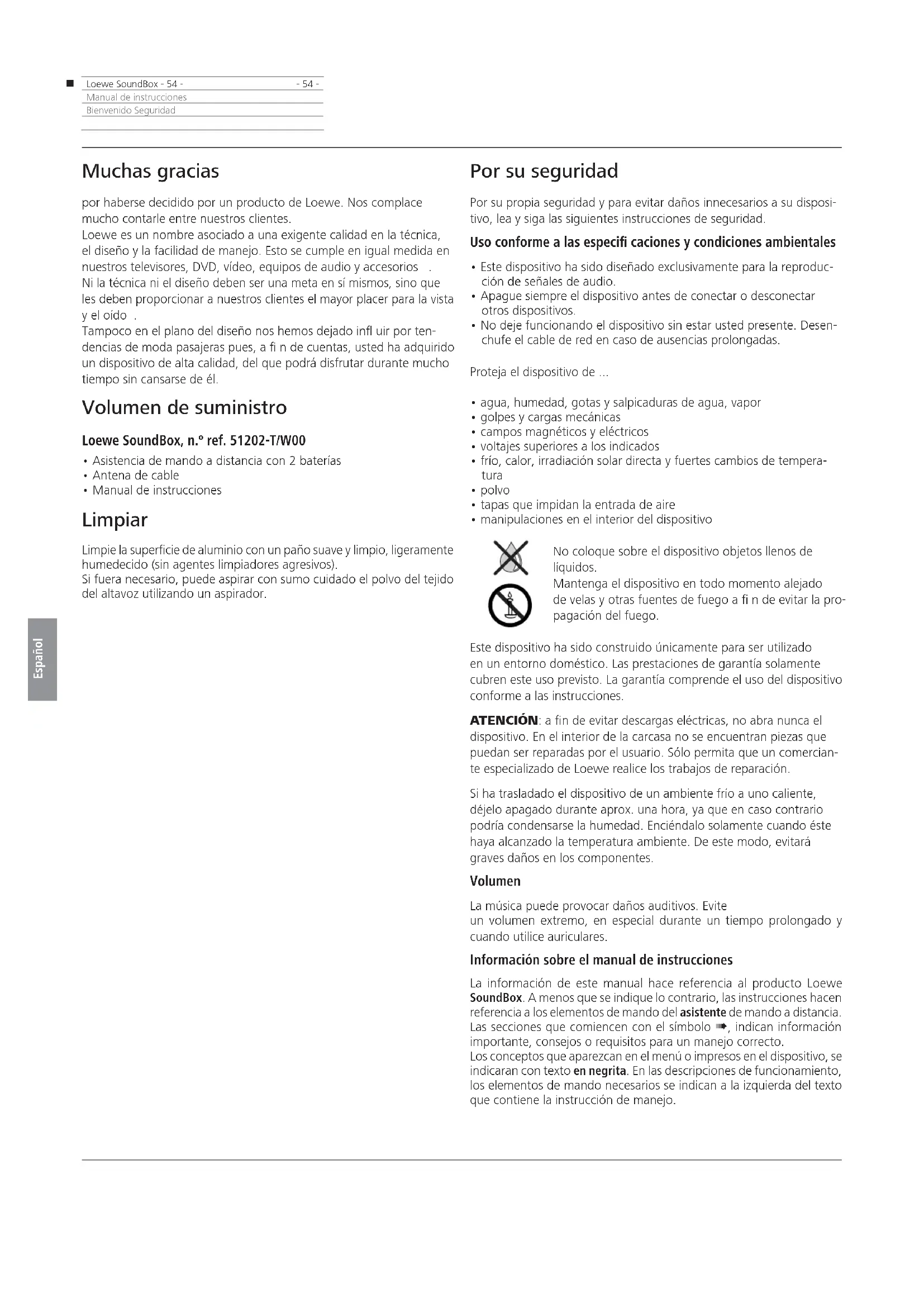 - 54 -Manual de instruccionesBienvenido Seguridad Muchas gracias por haberse decidido por un producto de Loewe. Nos complace mucho contarle entre nuestros clientes. Loewe es un nombre asociado a una exigente calidad en la técnica, el diseño y la facilidad de manejo. Esto se cumple en igual medida en nuestros televisores, DVD, vídeo, equipos de audio y accesorios . Ni la técnica ni el diseño deben ser una meta en sí mismos, sino que les deben proporcionar a nuestros clientes el mayor placer para la vista y el oído . Tampoco en el plano del diseño nos hemos dejado inÇ uir por ten- dencias de moda pasajeras pues, a Æ n de cuentas, usted ha adquirido un dispositivo de alta calidad, del que podrá disfrutar durante mucho tiempo sin cansarse de él. Volumen de suministro Loewe SoundBox, n.º ref. 51202-T/W00