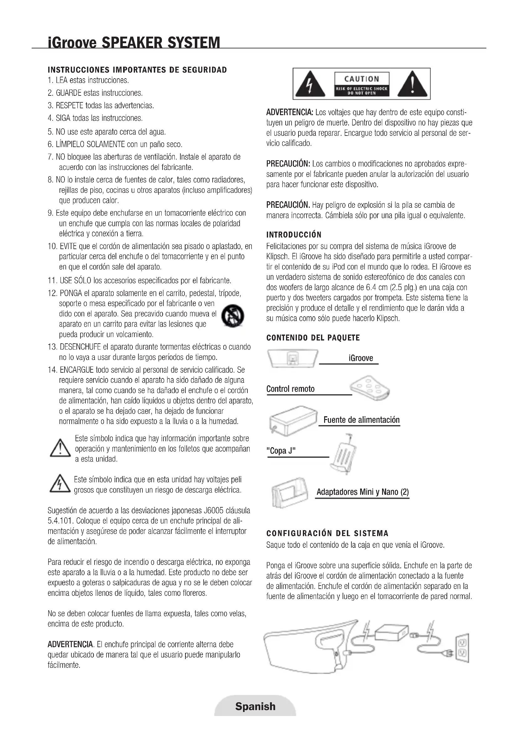mentación y asegúrese de poder alcanzar fácilmente el interruptor de alimentación. Para reducir el riesgo de incendio o descarga eléctrica, no exponga este aparato a la lluvia o a la humedad. Este producto no debe ser expuesto a goteras o salpicaduras de agua y no se le deben colocar encima objetos llenos de líquido, tales como floreros. No se deben colocar fuentes de llama expuesta, tales como velas, encima de este producto. ADVERTENCIA. El enchufe principal de corriente alterna debe quedar ubicado de manera tal que el usuario puede manipularlo fácilmente. ADVERTENCIA: Los voltajes que hay dentro de este equipo consti- tuyen un peligro de muerte. Dentro del dispositivo no hay piezas que el usuario pueda reparar. Encargue todo servicio al personal de ser- vicio calificado. PRECAUCIÓN: Los cambios o modificaciones no aprobados expre- samente por el fabricante pueden anular la autorización del usuario para hacer funcionar este dispositivo. PRECAUCIÓN. Hay peligro de explosión si la pila se cambia de manera incorrecta. Cámbiela sólo por una pila igual o equivalente. INTRODUCCIÓN Felicitaciones por su compra del sistema de música iGroove de Klipsch. El iGroove ha sido diseñado para permitirle a usted compar- tir el contenido de su iPod con el mundo que lo rodea. El iGroove es un verdadero sistema de sonido estereofónico de dos canales con dos woofers de largo alcance de 6.4 cm (2.5 plg.) en una caja con puerto y dos tweeters cargados por trompeta. Este sistema tiene la precisión y produce el detalle y el rendimiento que le darán vida a su música como sólo puede hacerlo Klipsch.