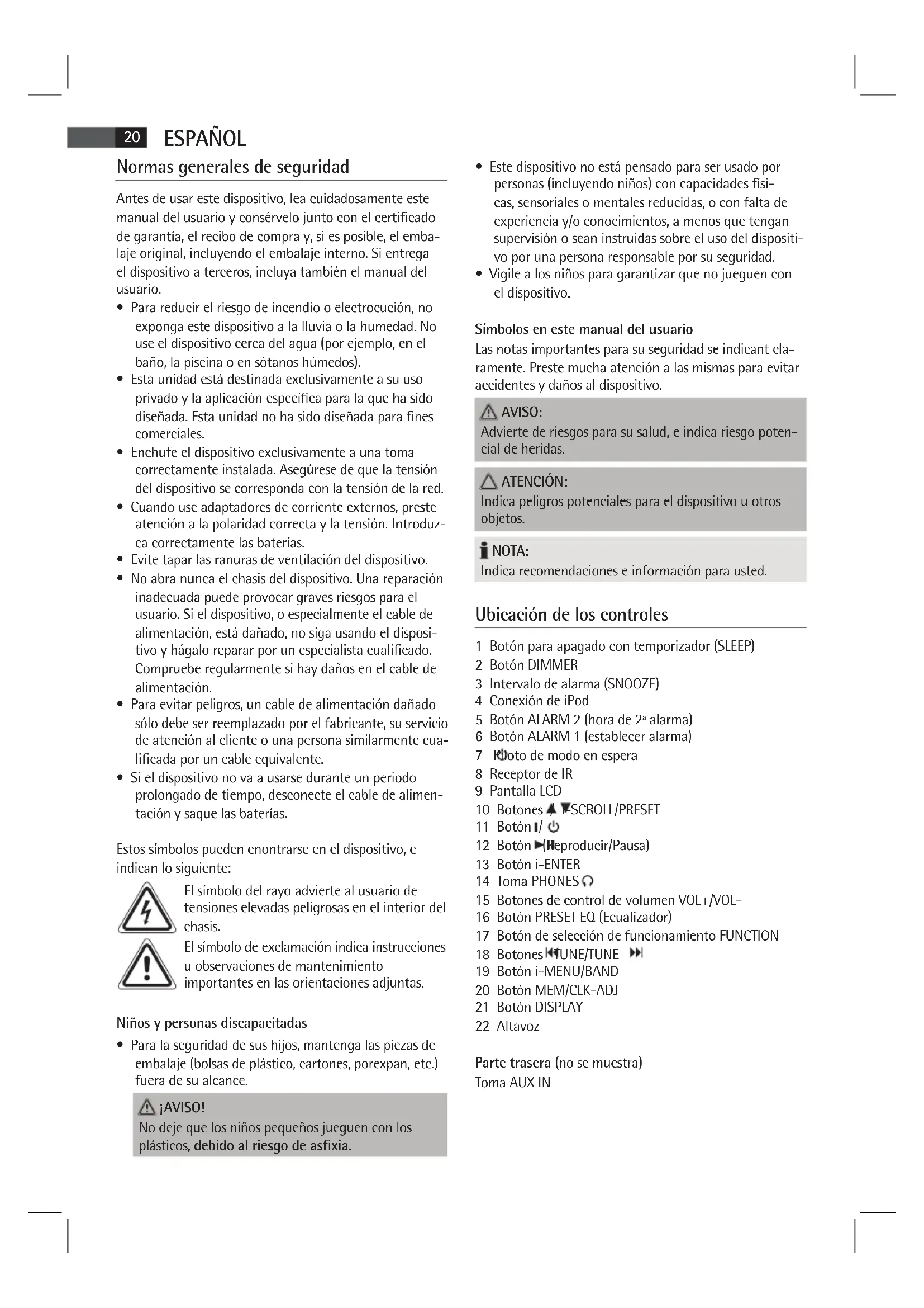 - Vigile a los niños para garantizar que no jueguen con el dispositivo. Símbolos en este manual del usuario Las notas importantes para su seguridad se indicant cla- ramente. Preste mucha atención a las mismas para evitar accidentes y daños al dispositivo. AVISO: Advierte de riesgos para su salud, e indica riesgo poten- cial de heridas. ATENCIÓN: Indica peligros potenciales para el dispositivo u otros objetos. NOTA: Indica recomendaciones e información para usted. Ubicación de los controles 1 Botón para apagado con temporizador (SLEEP) 2 Botón DIMMER 3 Intervalo de alarma (SNOOZE) 4 Conexión de iPod 5 Botón ALARM 2 (hora de 2ª alarma) 6 Botón ALARM 1 (establecer alarma) 7 Piloto de modo en espera 8 Receptor de IR 9 Pantalla LCD 10 Botones / i-SCROLL/PRESET 11 Botón / 12 Botón (Reproducir/Pausa) 13 Botón i-ENTER 14 Toma PHONES 15 Botones de control de volumen VOL+/VOL- 16 Botón PRESET EQ (Ecualizador) 17 Botón de selección de funcionamiento FUNCTION 18 Botones TUNE/TUNE 19 Botón i-MENU/BAND 20 Botón MEM/CLK-ADJ 21 Botón DISPLAY 22 Altavoz Parte trasera (no se muestra) Toma AUX IN21 ESPAÑOL Mando a distancia 1 Botón de selección de funcionamiento FUNC 2 Botón DISPLAY 3 Botón (Reproducir/Pausa) 4 Botón CLK-ADJ/MEM 5 Botón BAND/i-MENU 6 Botón i-REPEAT/ 7 Botón SNOOZE 8 Botón EQ 9 Botones de control de volumen VOLUME+/VOLUME- 10 Botón ALARM 1 11 Botón ALARM 2 12 Botón i-ENTER 13 Botones / i-SCROLL/PRESET 14 Botones TUNING /SKIP / (Búsqueda adelante/ atrás) 15 Botón