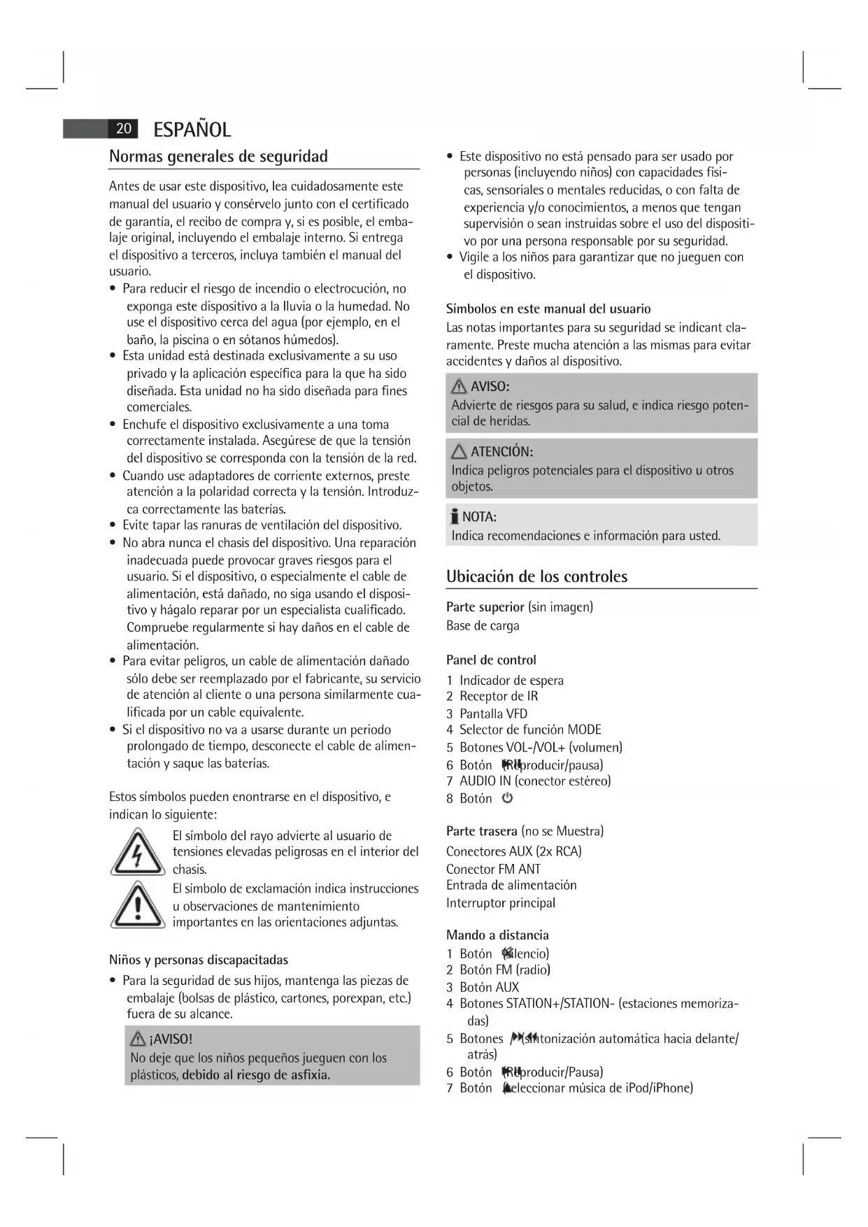 - Este dispositivo no está pensado para ser uso por personas (incluyendo niños) con capacities fisicas, sensoriales o mentalares reducidas, o con falta de experiencia y/o conocimientos, a menos que tengan supervisión o Seaninstruidas sobre el uso del dispositivo por una persona responsable por sucurity.