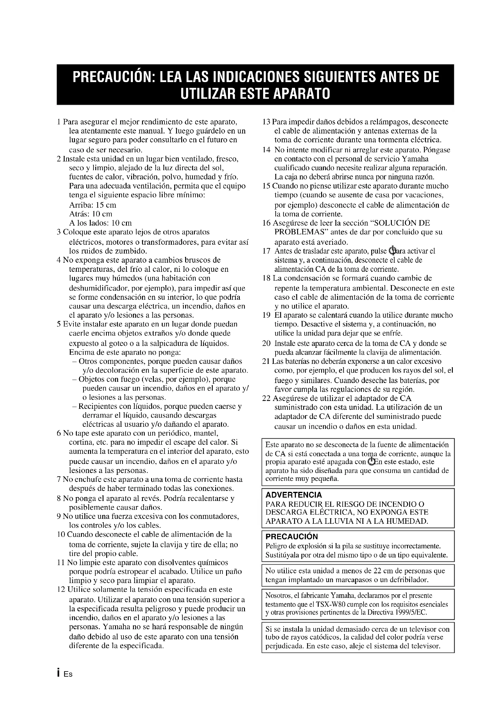 APARATO A LA LLUVIA NI A LA HUMEDAD. PRECAUCIÓN Peligro de explosión si la pila se sustituye incorrectamente. Sustitúyala por otra del mismo tipo o de un tipo equivalente. No utilice esta unidad a menos de 22 cm de personas que tengan implantado un marcapasos o un defribilador. Nosotros, el fabricante Yamaha, declaramos por el presente testamento que el TSX-W80 cumple con los requisitos esenciales y otras provisiones pertinentes de la Directiva 1999/5/EC. Si se instala la unidad demasiado cerca de un televisor con tubo de rayos catódicos, la calidad del color podría verse perjudicada. En este caso, aleje el sistema del televisor.1 Es Español PREPARATION NOMBRES DE LAS PARTES Y SUS FUNCIONES