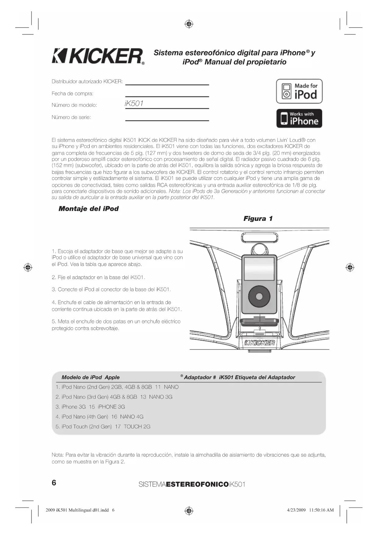 protegido contra sobrevoltaje. Montaje del iPod Figura 1 Nota: Para evitar la vibración durante la reproducción, instale la almohadilla de aislamiento de vibraciones que se adjunta, como se muestra en la Figura 2. 2009 iK501 Multilingual d01.indd 62009 iK501 Multilingual d01.indd 6 4/23/2009 11:50:16 AM4/23/2009 11:50:16 AM7 Instrucciones importantes de seguridad Lea y siga todas las instrucciones que aparecen en este manual. Siga todas las recomendaciones de seguridad y procedimiento para evitar lesionarse o dañar el producto KICKER o el dispositivo de entretenimiento portátil. No utilice el sistema estereofónico iK501 cerca del agua o en ambientes en que se exponga a líquidos; estos ambientes son, entre otros, aquellos en que puede haber salpicaduras, goteras, fi ltraciones, derrames y exposición a la lluvia. No le ponga ni encima ni cerca contenedores de líquidos. No lo limpie con limpiadores líquidos. Límpielo sólo con un paño seco. Ubíquelo sólo en lugares con ventilación abierta adecuada que deje un mínimo de 4 plg. de espacio libre por todos los lados. No lo ponga sobre superfi cies que impidan el fl ujo de aire por dentro y no lo cubra de manera de impedir tal fl ujo. No lo ponga cerca de fuentes de calor tales como, entre otras, cocinas, radiadores, elementos de calefacción, fuentes de calor electrónicas y lugares donde se pueda generar calor solar excesivo. No lo instale cerca de llamas ni le ponga cerca objetos infl amables. Enchúfelo en un enchufe eléctrico accesible en todo momento. El enchufe polarizado del iK501 tiene una pata ancha y una pata angosta que deben encajar en las ranuras ancha y angosta correspondientes del enchufe eléctrico (sólo en EE.UU. y Canadá). No meta el enchufe del iK501 a la fuerza en el enchufe eléctrico. Si el enchufe no entra, consulte a un electricista para mejorar el enchufe eléctrico de manera adecuada. El cordón de alimentación debe estar ubicado de manera que quede protegido contra el aplastamiento y la posibilidad de que sea pisado, se tropiece con él o se desenchufe accidentalmente del enchufe eléctrico o del iK501. No pase el cordón a través de puertas o por debajo de objetos que podrían dañarlo o desgarrar el material de aislamiento que rodea el conductor. Utilice sólo el cordón de alimentación que el fabricante ha suministrado con el iK501. Recomendamos utilizar un acondicionador de alimentación o protector contra sobrevoltaje y desenchufar el iK501 durante las tormentas eléctricas o situaciones que podrían causar fl uctuaciones de voltaje en el sistema eléctrico. Figura 2 Figura 3 Asa de transporte Entrada auxiliar estereofónica de 1/8 de plg. Alimentación de corriente continua 22 V Receptor remoto de infrarrojo Pantalla LCD Base Control rotatorio Almohadilla de aislamiento de vibraciones Excitadores de gama completa de frecuencias de 5 plg. (127 mm) Tweeters de domo de seda de 3/4 plg. 20mm) Patas antirayones resistentes al deslizamiento Salida estereofónica RCA Radiador pasivo cuadrado Salida de video compuesto 2009 iK501 Multilingual d01.indd 72009 iK501 Multilingual d01.indd 7 4/23/2009 11:50:17 AM4/23/2009 11:50:17 AM8 SISTEMAESTEREOFONICOiK501 Treb Bass Vol Aux-In Standby Uso del control rotatorio del menú de sistemaEl control rotatorio del sistema estereofónico iK501 es una interfaz de usuario intuitiva. Las opciones de menú de sistema que aparecen en la pantalla LCD que se muestra abajo se pueden ajustar con el control rotatorio, que además se utiliza como botón pulsador para encender el iK501 y para desplazarse por los menús visibles en la pantalla LCD. Girar el control rotatorio permite ajustar los parámetros del menú seleccionado.Menú de sistema iK501Encienda el iK501 y seleccione opciones de menú oprimiendo el control rotatorio.Gire el control rotatorio para ajustar los parámetros del menú de sistemaDespués de enchufar el cordón de alimentación en la entrada de corriente continua ubicada en la parte de atrás del iK501, la unidad queda en modalidad de espera, como se indica en la pantalla LCD del menú de sistema. Encienda el iK501 oprimiendo una vez el control rotatorio. Cuando el dispositivo se enciende, el logotipo de KICKER y la palabra “Vol” aparecen en el menú de sistema. Volumen: De manera predeterminada, el iK501 adopta la modalidad de control de volumen y la palabra “Vol” aparece en la pantalla LCD. Gire el control rotatorio para subir o bajar el volumen. Si se deja seleccionado algún otro menú, el control rotatorio lleva automáticamente a la modalidad de control de volumen después de un corto período de tiempo. Para desplazarse por otros menús, oprima el control rotatorio. Cada vez que oprima el control rotatorio, el sistema pasa al siguiente menú de la lista agudos > bajos > entrada auxiliar > volumen (Treb > Bass > Aux-In > Vol) hasta llegar nuevamente al menú de agudos (Treb). Agudos: Ajuste los agudos del iK501 oprimiendo el control rotatorio para desplazarse por los menús hasta que aparezca el menú de agudos (Treb) en la pantalla LCD. Gire el control rotatorio en el sentido de las agujas del reloj para aumentar los agudos y en el sentido contrario para reducirlos. Bajos: Ajuste el nivel de bajos del iK501 oprimiendo el control rotatorio para desplazarse por los menús hasta que aparezca el menú de bajos (Bass) en la pantalla LCD. Gire el control rotatorio en el sentido de las agujas del reloj para aumentar los bajos y en el sentido contrario para reducirlos Entrada auxiliar: Para habilitar la entrada auxiliar del iK501, debe haber un dispositivo externo enchufado en la entrada auxiliar estereofónica de 1/8 de plg. ubicada en la parte de atrás de la unidad. Oprima el control rotatorio para desplazarse por los menús hasta que aparezca el de entrada auxiliar (Aux-In). Gire el control rotatorio en el sentido de las agujas del reloj para habilitar la entrada auxiliar. Cuando se habilita la entrada auxiliar, el menú de sistema presenta