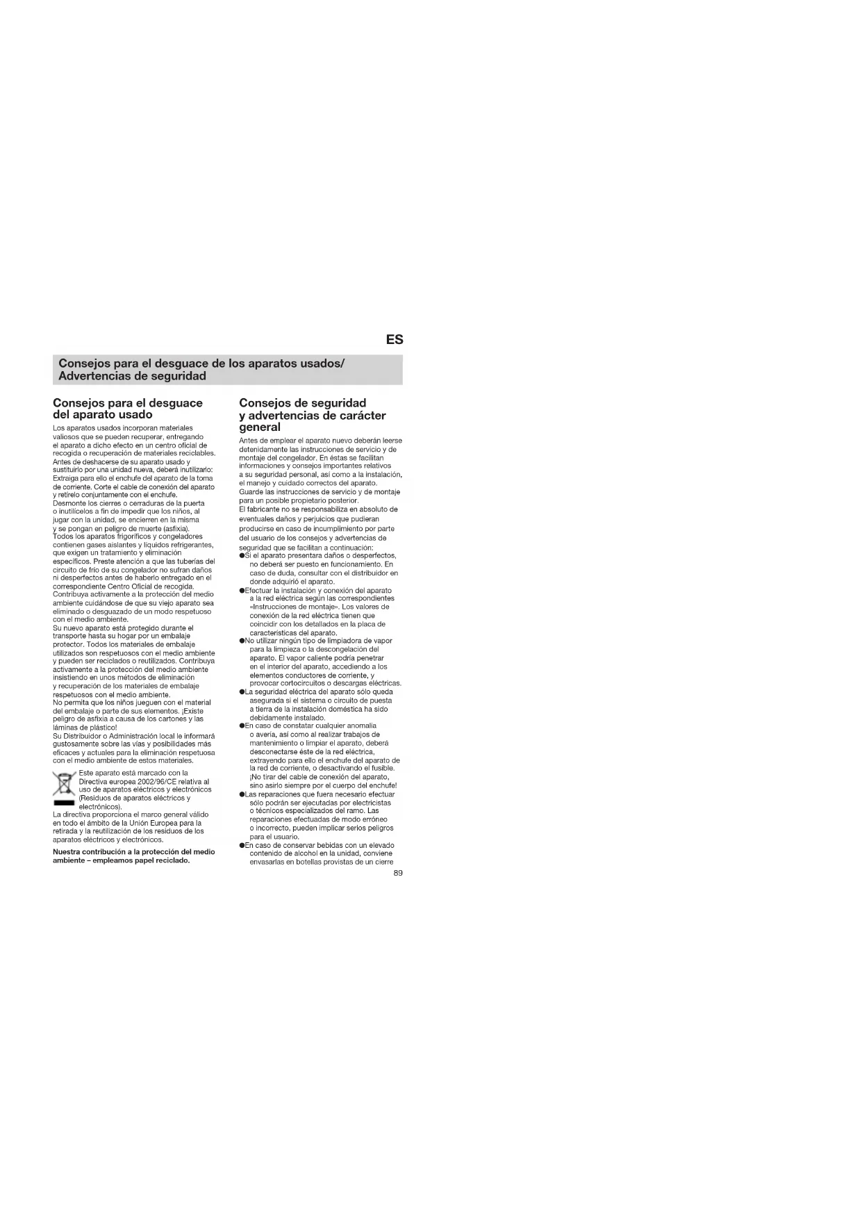 Consejos para el desguace de los aparatos usados/ Advertencias de seguridad Consejos para el desguace del aparato usado Los aparatos usados incorporan materiales valiosos que se pueden recuperar, entregando el aparato a dicho efecto en un centro oficial de recogida o recuperación de materiales reciclables. Antes de deshacerse de su aparato usado y sustituirlo por una unidad nueva, deberá inutilizarlo: Extraiga para ello el enchufe del aparato de la toma de corriente. Corte el cable de conexión del aparato y retírelo conjuntamente con el enchufe. Desmonte los cierres o cerraduras de la puerta o inutilícelos a fin de impedir que los niños, al jugar con la unidad, se encierren en la misma y se pongan en peligro de muerte (asfixia). Todos los aparatos frigoríficos y congeladores contienen gases aislantes y líquidos refrigerantes, que exigen un tratamiento y eliminación específicos. Preste atención a que las tuberías del circuito de frío de su congelador no sufran daños ni desperfectos antes de haberlo entregado en el correspondiente Centro Oficial de recogida. Contribuya activamente a la protección del medio ambiente cuidándose de que su viejo aparato sea eliminado o desguazado de un modo respetuoso con el medio ambiente. Su nuevo aparato está protegido durante el transporte hasta su hogar por un embalaje protector. Todos los materiales de embalaje utilizados son respetuosos con el medio ambiente y pueden ser reciclados o reutilizados. Contribuya activamente a la protección del medio ambiente insistiendo en unos métodos de eliminación y recuperación de los materiales de embalaje respetuosos con el medio ambiente. No permita que los niños jueguen con el material del embalaje o parte de sus elementos. ¡Existe peligro de asfixia a causa de los cartones y las láminas de plástico! Su Distribuidor o Administración local le informará gustosamente sobre las vías y posibilidades más eficaces y actuales para la eliminación respetuosa con el medio ambiente de estos materiales. Este aparato está marcado con la Directiva europea 2002/96/CE relativa al uso de aparatos eléctricos y electrónicos (Residuos de aparatos eléctricos y electrónicos). La directiva proporciona el marco general válido en todo el ámbito de la Unión Europea para la retirada y la reutilización de los residuos de los aparatos eléctricos y electrónicos. Nuestra contribución a la protección del medio ambiente – empleamos papel reciclado. Consejos de seguridad y advertencias de carácter general Antes de emplear el aparato nuevo deberán leerse detenidamente las instrucciones de servicio y de montaje del congelador. En éstas se facilitan informaciones y consejos importantes relativos a su seguridad personal, así como a la instalación, el manejo y cuidado correctos del aparato. Guarde las instrucciones de servicio y de montaje para un posible propietario posterior. El fabricante no se responsabiliza en absoluto de eventuales daños y perjuicios que pudieran producirse en caso de incumplimiento por parte del usuario de los consejos y advertencias de seguridad que se facilitan a continuación: ● Si el aparato presentara daños o desperfectos, no deberá ser puesto en funcionamiento. En caso de duda, consultar con el distribuidor en donde adquirió el aparato. ● Efectuar la instalación y conexión del aparato a la red eléctrica según las correspondientes «Instrucciones de montaje». Los valores de conexión de la red eléctrica tienen que coincidir con los detallados en la placa de características del aparato. ● No utilizar ningún tipo de limpiadora de vapor para la limpieza o la descongelación del aparato. El vapor caliente podría penetrar en el interior del aparato, accediendo a los elementos conductores de corriente, y provocar cortocircuitos o descargas eléctricas. ● La seguridad eléctrica del aparato sólo queda asegurada si el sistema o circuito de puesta a tierra de la instalación doméstica ha sido debidamente instalado. ● En caso de constatar cualquier anomalía o avería, así como al realizar trabajos de mantenimiento o limpiar el aparato, deberá desconectarse éste de la red eléctrica, extrayendo para ello el enchufe del aparato de la red de corriente, o desactivando el fusible. ¡No tirar del cable de conexión del aparato, sino asirlo siempre por el cuerpo del enchufe! ● Las reparaciones que fuera necesario efectuar sólo podrán ser ejecutadas por electricistas o técnicos especializados del ramo. Las reparaciones efectuadas de modo erróneo o incorrecto, pueden implicar serios peligros para el usuario. ● En caso de conservar bebidas con un elevado contenido de alcohol en la unidad, conviene envasarlas en botellas provistas de un cierre91