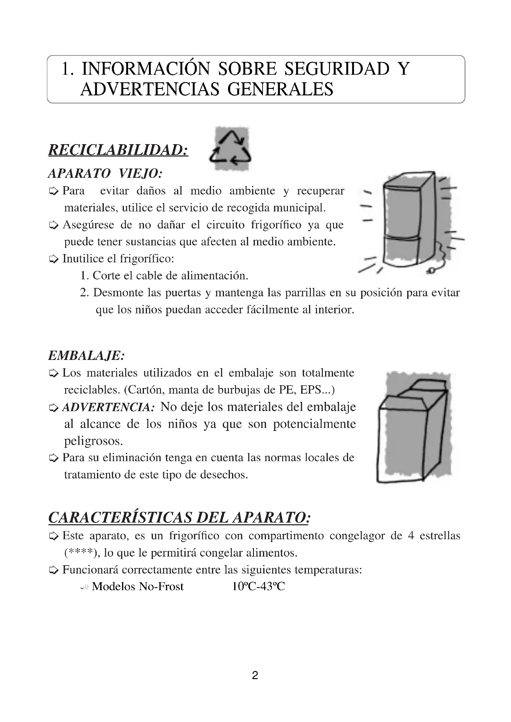 que los niños puedan acceder fácilmente al interior. EMBALAJE: Los materiales utilizados en el embalaje son totalmente reciclables. (Cartón, manta de burbujas de PE, EPS...) ADVERTENCIA: No deje los materiales del embalaje al alcance de los niños ya que son potencialmente peligrosos. Para su eliminación tenga en cuenta las normas locales de tratamiento de este tipo de desechos. CARACTERÍSTICAS DEL APARATO: Este aparato, es un frigorífico con compartimento congelagor de 4 estrellas (****), lo que le permitirá congelar alimentos. Funcionará correctamente entre las siguientes temperaturas: