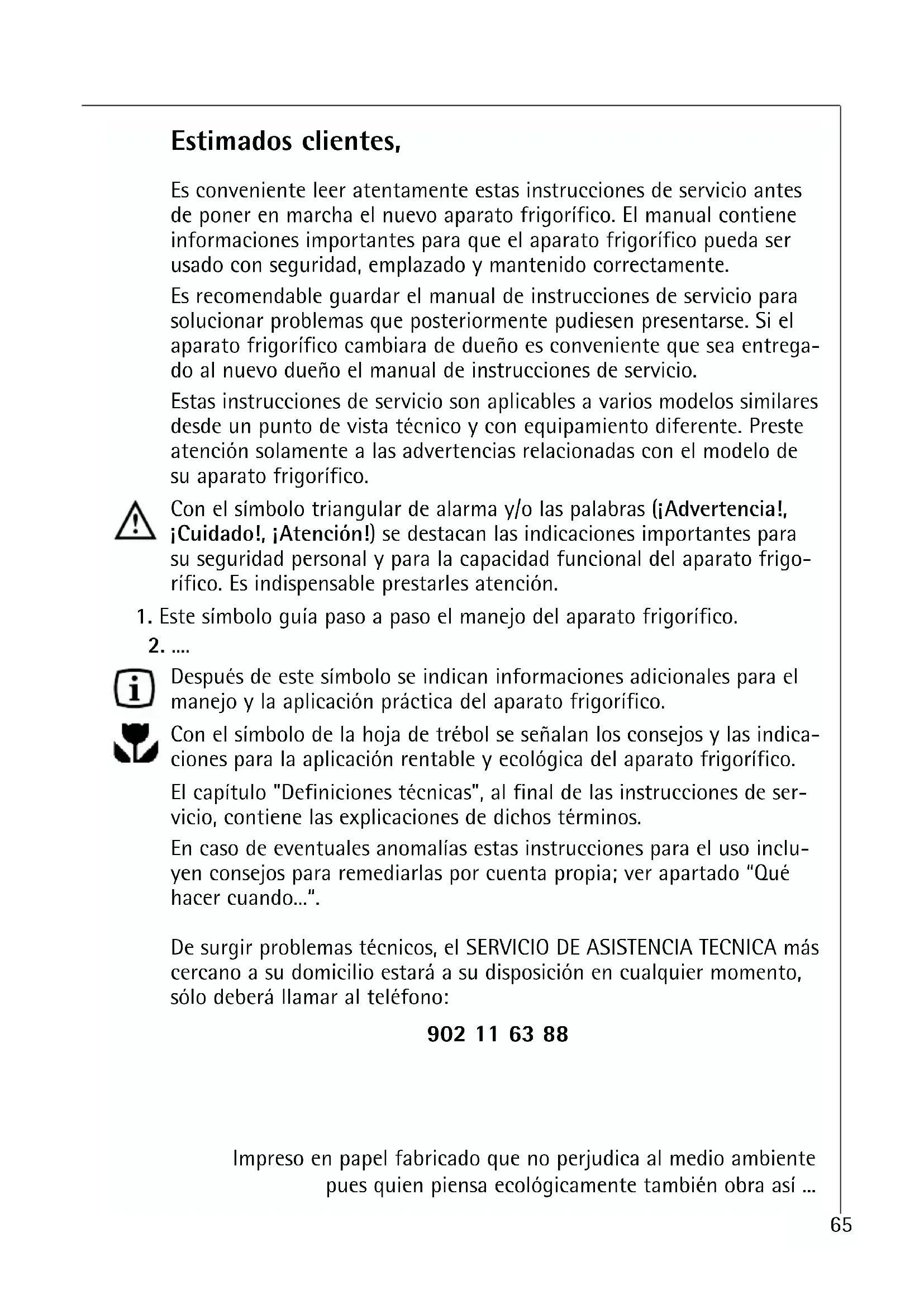 - Condensor De condensor heeft meestal de vorm van een rooster. In de conden- sor wordt het koelmiddel dat door de compressor verdicht is, gecon- denseerd. Hierbij komt warmte vrij die door de oppervlakte van de condensor aan de omgevingslucht afgegeven wordt. De condensor is daarom aan de buitenkant, meestal aan de achterkant van het appa- raat, aangebracht. Voor België: U kan onderdelen, toebehoren en verbruiksprodukten online bestellen op adres http://www.aeg.be Voor het online bestellen van onderdelen en accessoires, kijk op http://www.aeg.nl65 Estimados clientes, Es conveniente leer atentamente estas instrucciones de servicio antes de poner en marcha el nuevo aparato frigorífico. El manual contiene informaciones importantes para que el aparato frigorífico pueda ser usado con seguridad, emplazado y mantenido correctamente. Es recomendable guardar el manual de instrucciones de servicio para solucionar problemas que posteriormente pudiesen presentarse. Si el aparato frigorífico cambiara de dueño es conveniente que sea entrega- do al nuevo dueño el manual de instrucciones de servicio. Estas instrucciones de servicio son aplicables a varios modelos similares desde un punto de vista técnico y con equipamiento diferente. Preste atención solamente a las advertencias relacionadas con el modelo de su aparato frigorífico. Con el símbolo triangular de alarma y/o las palabras (¡Advertencia!, ¡Cuidado!, ¡Atención!) se destacan las indicaciones importantes para su seguridad personal y para la capacidad funcional del aparato frigo- rífico. Es indispensable prestarles atención.