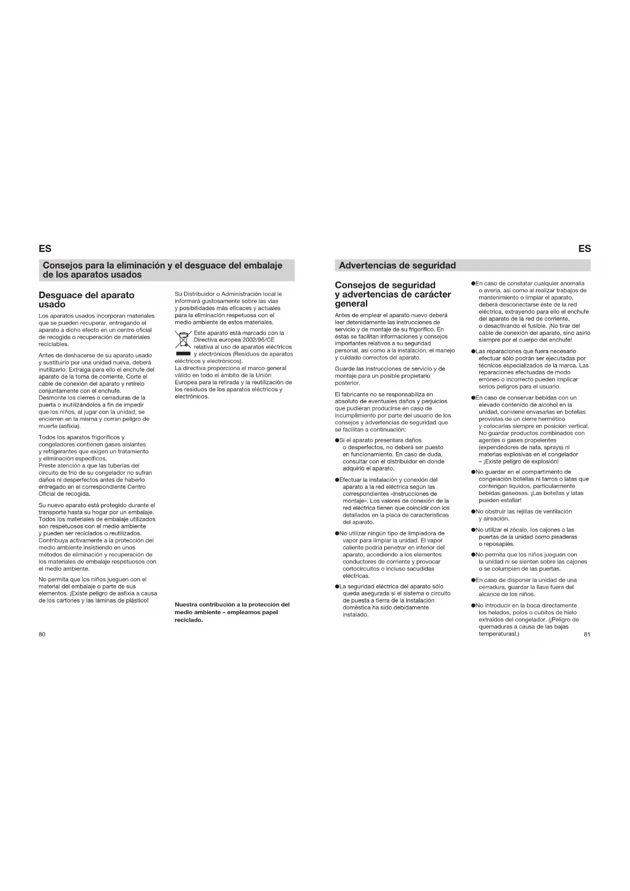 Consejos para la eliminación y el desguace del embalaje de los aparatos usados Desguace del aparato usado Los aparatos usados incorporan materiales que se pueden recuperar, entregando el aparato a dicho efecto en un centro oficial de recogida o recuperación de materiales reciclables. Antes de deshacerse de su aparato usado y sustituirlo por una unidad nueva, deberá inutilizarlo: Extraiga para ello el enchufe del aparato de la toma de corriente. Corte el cable de conexión del aparato y retírelo conjuntamente con el enchufe. Desmonte los cierres o cerraduras de la puerta o inutilizándolos a fin de impedir que los niños, al jugar con la unidad, se encierren en la misma y corran peligro de muerte (asfixia). Todos los aparatos frigoríficos y congeladores contienen gases aislantes y refrigerantes que exigen un tratamiento y eliminación específicos. Preste atención a que las tuberías del circuito de frío de su congelador no sufran daños ni desperfectos antes de haberlo entregado en el correspondiente Centro Oficial de recogida. Su nuevo aparato está protegido durante el transporte hasta su hogar por un embalaje. Todos los materiales de embalaje utilizados son respetuosos con el medio ambiente y pueden ser reciclados o reutilizados. Contribuya activamente a la protección del medio ambiente insistiendo en unos métodos de eliminación y recuperación de los materiales de embalaje respetuosos con el medio ambiente. No permita que los niños jueguen con el material del embalaje o parte de sus elementos. ¡Existe peligro de asfixia a causa de los cartones y las láminas de plástico! Su Distribuidor o Administración local le informará gustosamente sobre las vías y posibilidades más eficaces y actuales para la eliminación respetuosa con el medio ambiente de estos materiales. Este aparato está marcado con la Directiva europea 2002/96/CE relativa al uso de aparatos eléctricos y electrónicos (Residuos de aparatos eléctricos y electrónicos). La directiva proporciona el marco general válido en todo el ámbito de la Unión Europea para la retirada y la reutilización de los residuos de los aparatos eléctricos y electrónicos. Nuestra contribución a la protección del medio ambiente – empleamos papel reciclado.83