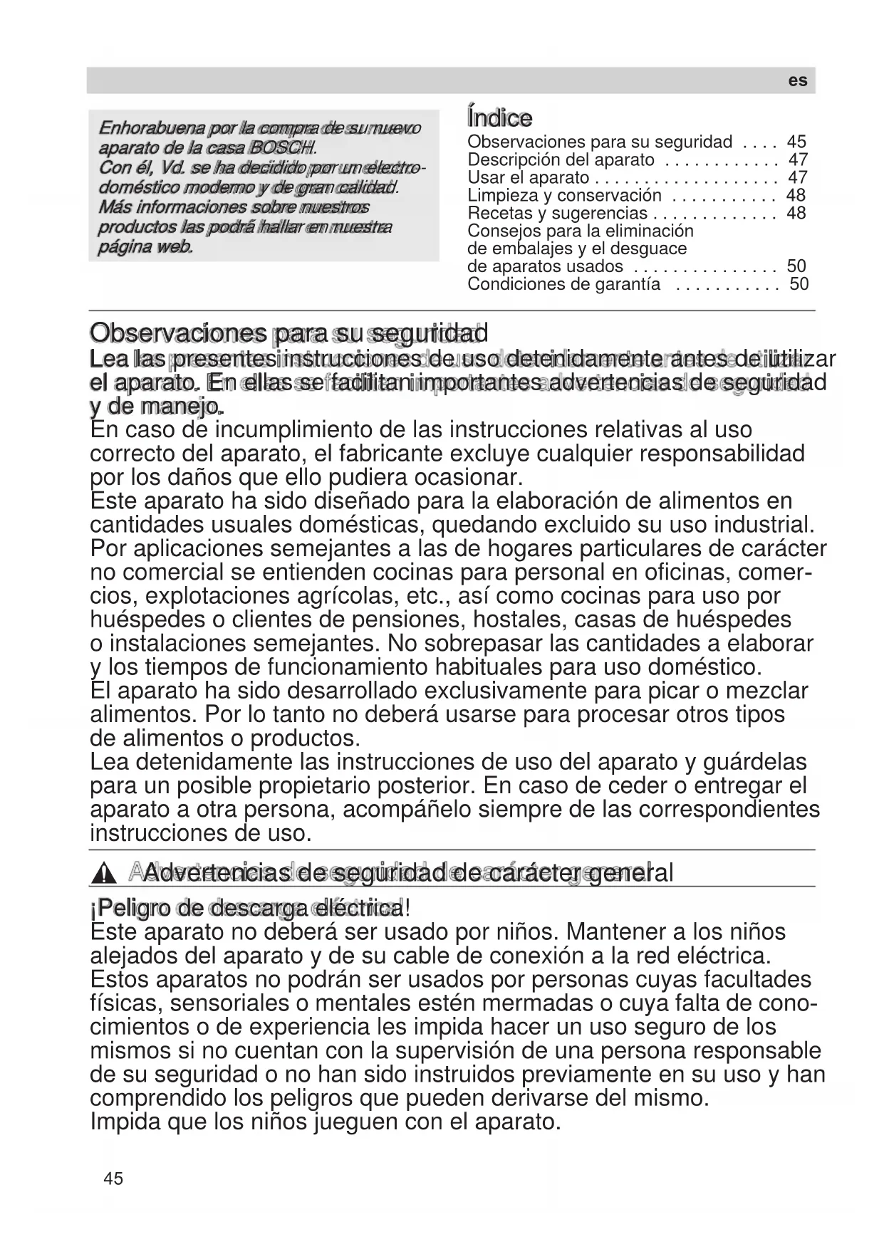 - Condiciones de garantía Observaciones para su seguridad Lea las presentes instrucciones de uso detenidamente antes de utilizar el aparato. En ellas se facilitan importantes advertencias de seguridad y de manejo. En caso de incumplimiento de las instrucciones relativas al uso correcto del aparato, el fabricante excluye cualquier responsabilidad por los daños que ello pudiera ocasionar. Este aparato ha sido diseñado para la elaboración de alimentos en cantidades usuales domésticas, quedando excluido su uso industrial. Por aplicaciones semejantes a las de hogares particulares de carácter no comercial se entienden cocinas para personal en oficinas, comer- cios, explotaciones agrícolas, etc., así como cocinas para uso por huéspedes o clientes de pensiones, hostales, casas de huéspedes o instalaciones semejantes. No sobrepasar las cantidades a elaborar y los tiempos de funcionamiento habituales para uso doméstico. El aparato ha sido desarrollado exclusivamente para picar o mezclar alimentos. Por lo tanto no deberá usarse para procesar otros tipos de alimentos o productos. Lea detenidamente las instrucciones de uso del aparato y guárdelas para un posible propietario posterior. En caso de ceder o entregar el aparato a otra persona, acompáñelo siempre de las correspondientes instrucciones de uso. , Advertencias de seguridad de carácter general ¡Peligro de descarga eléctrica! Este aparato no deberá ser usado por niños. Mantener a los niños alejados del aparato y de su cable de conexión a la red eléctrica. Estos aparatos no podrán ser usados por personas cuyas facultades físicas, sensoriales o mentales estén mermadas o cuya falta de cono- cimientos o de experiencia les impida hacer un uso seguro de los mismos si no cuentan con la supervisión de una persona responsable de su seguridad o no han sido instruidos previamente en su uso y han comprendido los peligros que pueden derivarse del mismo. Impida que los niños jueguen con el aparato. p. 50