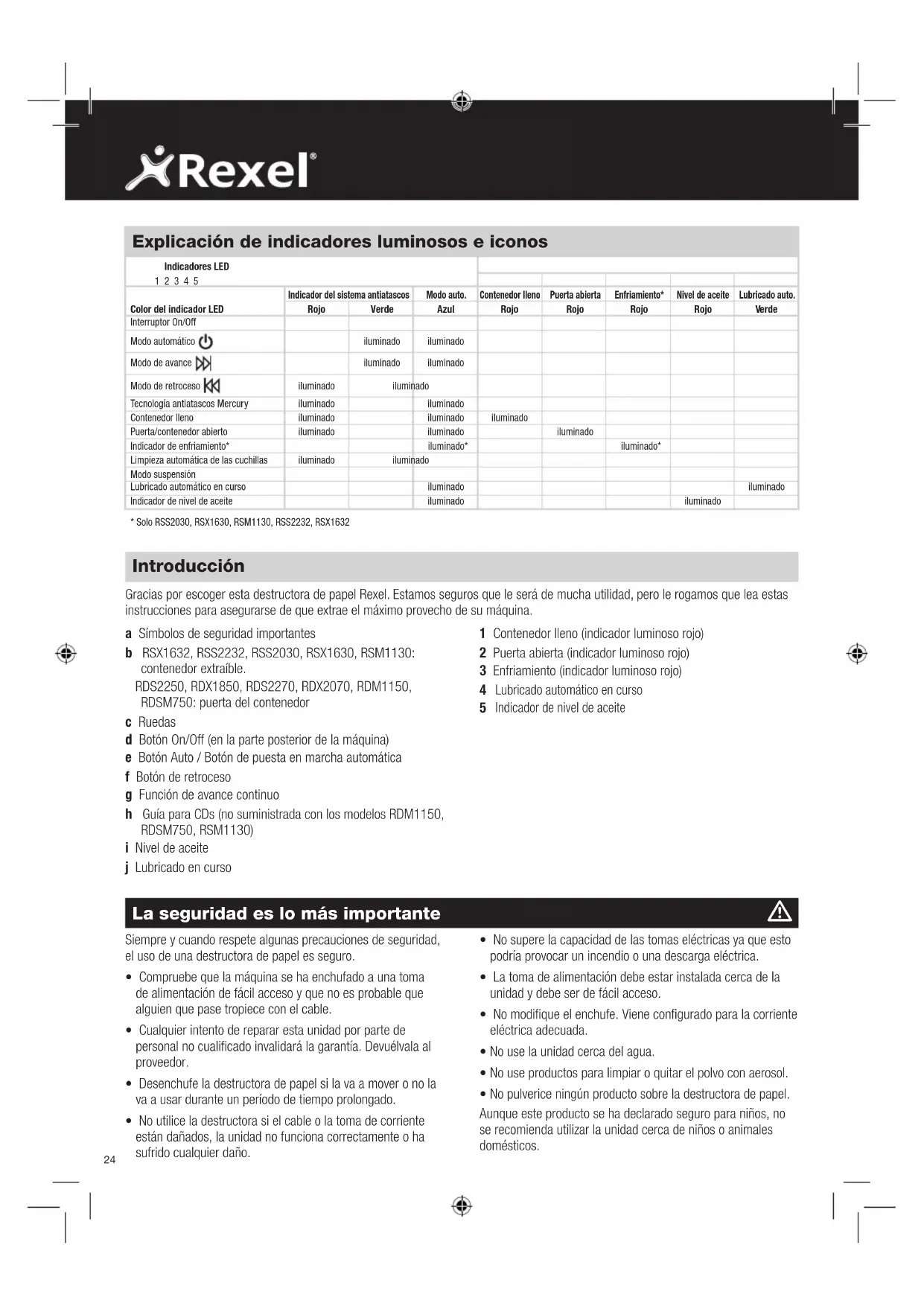 Tecnología antiatascos Mercury Las destructoras de papel Mercury solo destruyen pilas de papel adecuadas a su capacidad de hojas. Por ejemplo, si una destructora tiene una capacidad de 22 hojas, no permitirá la destrucción de un número mayor de hojas. Los sensores situados en la ranura de entrada de papel miden el grosor del papel que va a destruirse. La posibilidad de destruir o no el papel se comunica mediante los indicadores luminosos rojo y verde. El indicador luminoso verde significa que la pila de papel está dentro de la capacidad de hojas de la destructora y ésta está preparada para destruir. El indicador luminoso rojo significa que la cantidad de papel es excesiva y debe quitar algunas hojas para poder destruirlas. Dado que no puede destruir más hojas de papel que las indicadas por su capacidad de destrucción, se evitan los atascos del papel. Ahorra el tiempo que se pierde recuperando el papel y desbloqueando los atascos, sin mencionar el desorden que puede causar. Ocasiones excepcionales de atasco En el caso improbable de que la destructora se atasque, utilice la función de retroceso para desbloquearla (consulte la sección correspondiente a la función de retroceso). Alternar entre las funciones de retroceso y de avance continuo ayudará a desbloquear el área de alimentación. Función de seguridad de apertura de la puerta Si se abre la puerta mientras se destruyen documentos, como medida de seguridad la destructora se detendrá instantáneamente y el indicador/símbolo de puerta abierta se iluminará de color rojo. Sobrecalentamiento Si se utilizan los modelos para oficinas pequeñas (RSS2030, RSX1630, RSM1130, RSS2232 y RSX1632) de forma continua durante períodos prolongados de tiempo, es posible que la destructora se sobrecaliente. Si ocurre esto, se iluminará el símbolo del termómetro situado en el panel indicador. El símbolo del termómetro dejará de iluminarse cuando la destructora esté lista de nuevo para su uso. Panel de control de la destructora de papel RetrocesoAvance Auto La seguridad es lo más importante Este símbolo significa que debe tener cuidado porque el cabello largo puede quedar atrapado en el mecanismo de corte. Este símbolo significa que no debe meter la mano en la ranura de entrada del mecanismo de corte. Este símbolo significa que debe tener cuidado con las corbatas o cualquier otra prenda suelta que pudiera queda atrapada en el mecanismo de corte. Este símbolo significa que debe mantener a los niños alejados de la destructora. Este símbolo significa que debe tener cuidado con las joyas sueltas que pudieran quedar atrapadas en el mecanismo de corte. Este símbolo significa que la puerta está abierta. Este símbolo significa que el contenedor está lleno. Este símbolo significa que no debe pulverizar aerosoles sobre la máquina. Este símbolo significa que la máquina se está enfriando. Solo RSM1130, RDM1150 y RDSM750. Este símbolo significa que no debe destruir CDs. Este símbolo significa que no debe destruir tarjetas de crédito. Este símbolo significa que no debe destruir grapas. Este símbolo significa que no debe destruir clips de papel. Este símbolo indica el nivel de aceite. Este símbolo significa que el lubricado está en curso. Preparación inicial El diseño de la destructora incluye el lubricado automático de las cuchillas, según sea necesario, para garantizar que el producto siga funcionando al máximo rendimiento y prolongar su vida útil. Antes de encender la unidad por primera vez, abra la tapa del contenedor de aceite en la parte superior (j) y vierta la botella de 60 ml de aceite lubricante, que se suministra con la destructora. Esta cantidad es suficiente para permitir que la destructora funcione por primera vez y siga funcionando durante aproximadamente una hora hasta que deba rellenar el contenedor. Mantenga pulsado el botón Auto (f) durante 5 segundos para iniciar el sistema de preparación del aceite lubricante. Solo es necesario realizar esta operación la primera vez que se utiliza la destructora. Cuando se encienda el indicador de llenado de aceite , levante la tapa del contenedor de aceite (j) y rellénelo con una botella del aceite lubricante Rexel estándar (1760049). La operación de lubricado automático tarda aproximadamente 2 segundos y durante este tiempo escuchará la bomba de distribución. El lubricado automático se pone en funcionamiento cuando se haya utilizado la destructora durante 15 minutos.26 Función de retroceso 1 Si, mientras que destruye un documento, desea invertir la dirección del funcionamiento de la destructora, se ha incorporado un botón de retroceso (f) para su comodidad. 2 Cuando se pulsa el botón de retroceso, las cuchillas cambian de dirección, permitiendo la recuperación del documento que se está destruyendo. El indicador del sistema antiatascos se iluminará de color rojo. 3 La función de retroceso sólo funciona mientras se pulsa el botón. Cuando se suelta el botón de retroceso, la destructora pasa a modo de espera. 4 Para volver al modo automático, pulse de nuevo el botón Auto (e). Destrucción de CDs y tarjetas de crédito Los modelos RSM1130, RDM1150, RDM1170, RDM750 y RDM770 no pueden destruir CDs o tarjetas de crédito, por lo tanto, esta sección no es aplicable a estos tres modelos. Todos los demás modelos Mercury pueden destruir CDs y tarjetas de crédito de la siguiente forma: 1 Se suministra una bandeja independiente para recoger los restos de los CDs destruidos. Antes de destruir ningún CD o tarjeta de crédito, compruebe que está colocada correctamente sobre el riel del contenedor o el contenedor interno (modelos para oficinas pequeñas). Debe deshacerse de los restos de los CDs y tarjetas de crédito por separado de los de papel. 2 Tire de la guía para CDs (h) situada en el centro de la ranura de entrada de papel y colóquela sobre la ranura de entrada de papel. 3 Si va a destruir tarjetas de crédito, ponga la destructora en el modo