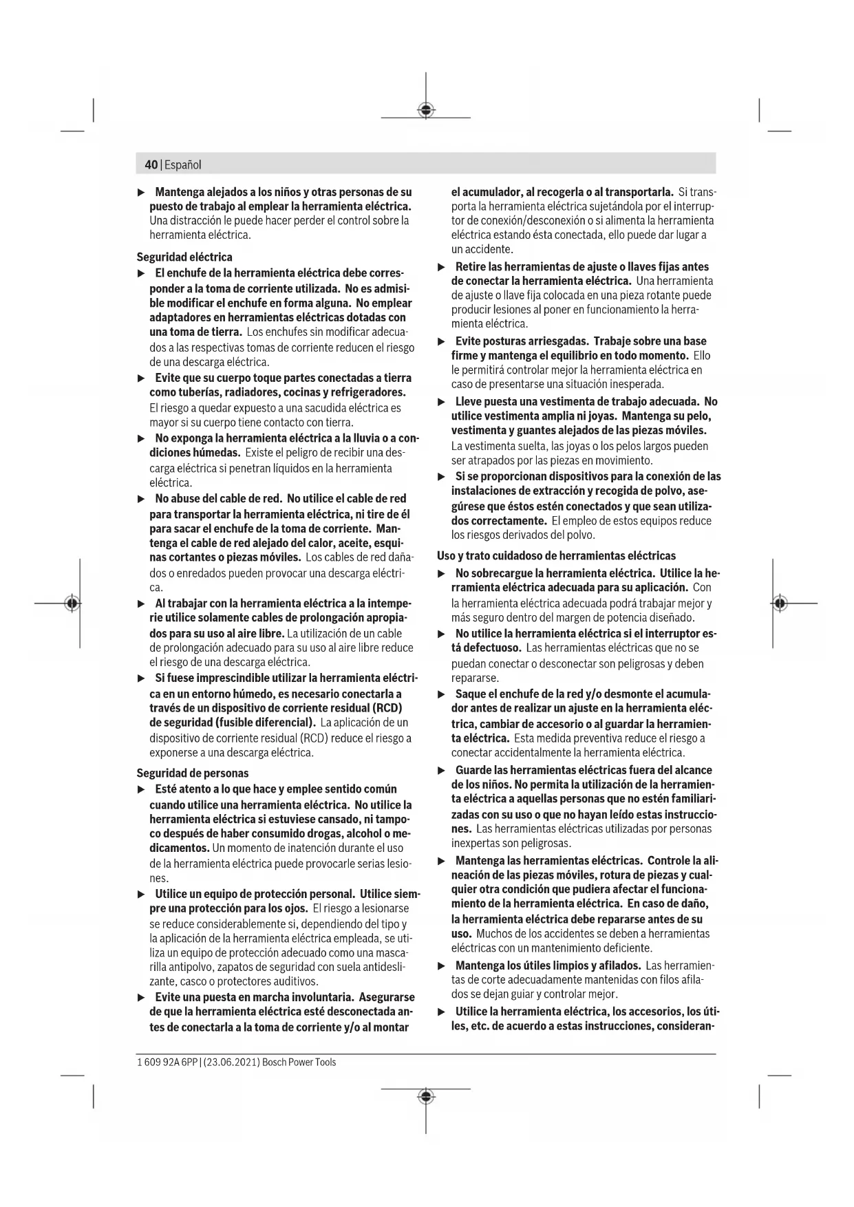 75 30 M 14 11500 45 82 – M 14 11500 80 Girar el cabezal del engranaje (ver figuraA) u Antes de cualquier manipulación en la herramienta eléctrica, sacar el enchufe de red de la toma de co- rriente. Puede girar la cabeza del engranaje en pasos de 90 °. De es- te modo, el interruptor de conexión/desconexión puede si- tuarse en una posición de manejo más adecuada para casos especiales, por ejemplo, para zurdos. Desenrosque totalmente los 4 tornillos. Gire la cabeza del engranaje cuidadosamente y sin quitarla de la caja a la nue- va posición. Apriete de nuevo firmemente los 4 tornillos. Aspiración de polvo y virutas El polvo de ciertos materiales como, pinturas que contengan plomo, ciertos tipos de madera y algunos minerales y meta- les, puede ser nocivo para la salud. El contacto y la inspira- ción de estos polvos pueden provocar en el usuario o en las personas circundantes reacciones alérgicas y/o enfermeda- des respiratorias. Ciertos polvos como los de roble, encina y haya son conside- rados como cancerígenos, especialmente en combinación con los aditivos para el tratamiento de la madera (cromatos, conservantes de la madera). Los materiales que contengan amianto solamente deberán ser procesados por especialis- tas. – A ser posible utilice un equipo para aspiración de polvo apropiado para el material a trabajar. – Observe que esté bien ventilado el puesto de trabajo. – Se recomienda una mascarilla protectora con un filtro de la clase P2. Observe las prescripciones vigentes en su país sobre los ma- teriales a trabajar. u Evite acumulaciones de polvo en el puesto de trabajo. Los materiales en polvo se pueden inflamar fácilmente. Operación Puesta en marcha u ¡Observe la tensión de alimentación! La tensión de ali- mentación deberá coincidir con las indicaciones en la placa de características de la herramienta eléctrica. Las herramientas eléctricas marcadas con 230V pue- den funcionar también a 220V. En el caso del servicio de la herramienta eléctrica con gene- radores de corriente móviles (generadores) que no tienen suficientes reservas de potencia o no tienen una regulación de tensión adecuada con amplificación de corriente de arranque, pueden producirse pérdidas de potencia o com- portamiento no típico durante la conexión. Por favor, preste atención a la idoneidad del generador de corriente utilizando, especialmente con respecto a la tensión de alimentación y la frecuencia. u Sujete el aparato sólo por las superficies de agarre aisladas y la empuñadura adicional. El útil podría en- trar en contacto con conductores eléctricos ocultos o el propio cable de la red. El contacto con conductores 1 609 92A 6PP | (23.06.2021) Bosch Power ToolsEspañol | 49 bajo tensión puede hacer que las partes metálicas de la herramienta eléctrica le provoquen una descarga eléctri- ca. Conexión/desconexión Para la puesta en servicio de la herramienta eléctrica, des- place la palanca de desenclavamiento (5) hacia detrás y pre- sione luego el interruptor de conexión/desconexión (3) ha- cia arriba. Para desconectar la herramienta eléctrica, suelte el inte- rruptor de conexión/desconexión (3). u Compruebe los útiles abrasivos antes del uso. El útil abrasivo debe estar montado correctamente y debe poder girar libremente. Realice una marcha de prueba de como mínimo 1 minuto sin carga. No utilice útiles abrasivos dañados, excéntricos o que vibran. Los úti- les abrasivos dañados pueden estallar y originar lesiones. Desconexión de retroceso