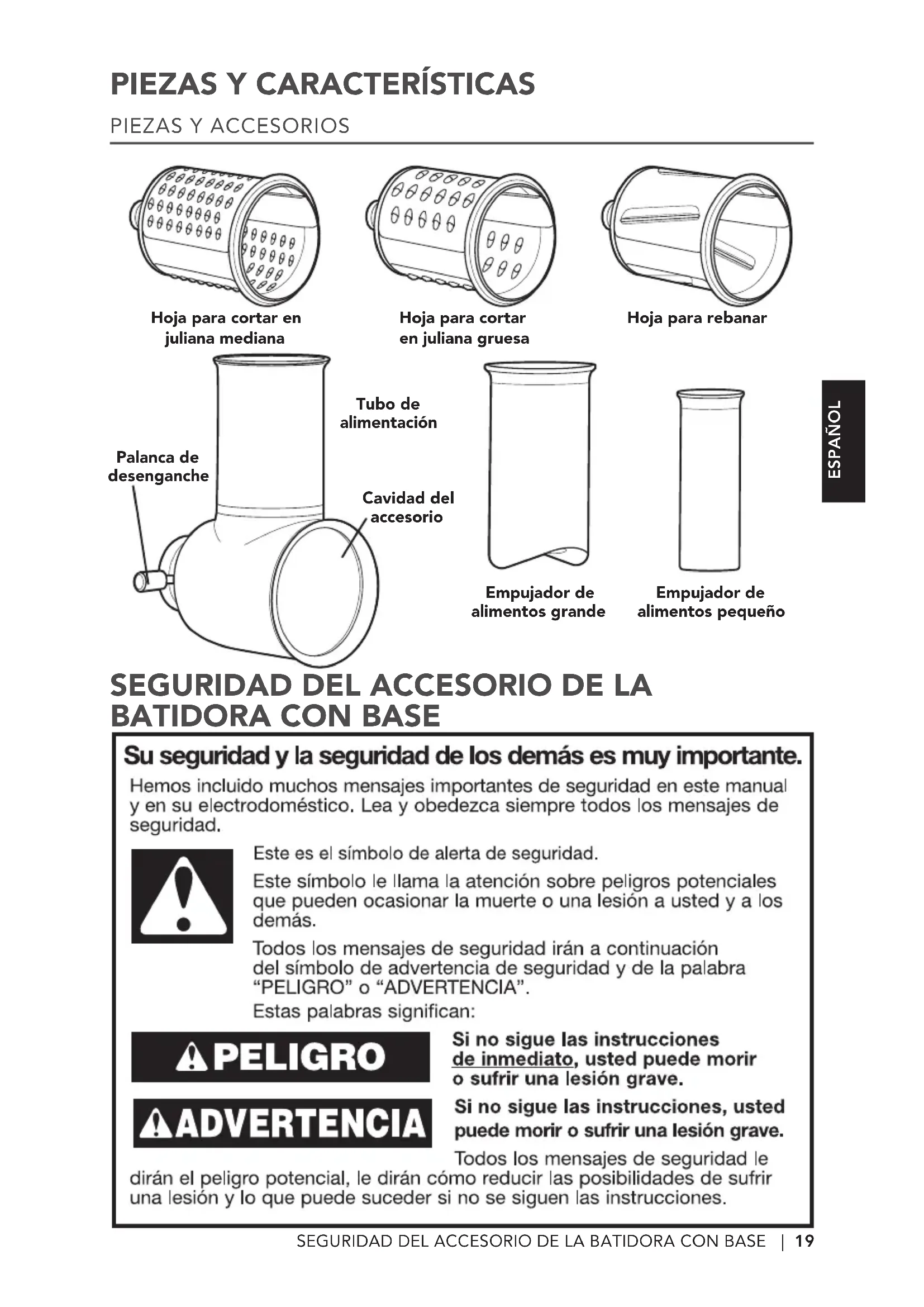 accesorio cortador/rallador de alimentos frescos de la batidora con base) después de cada uso del accesorio y antes de la limpieza. Asegúrese de que el motor se detenga por completo antes de desensamblar el producto.