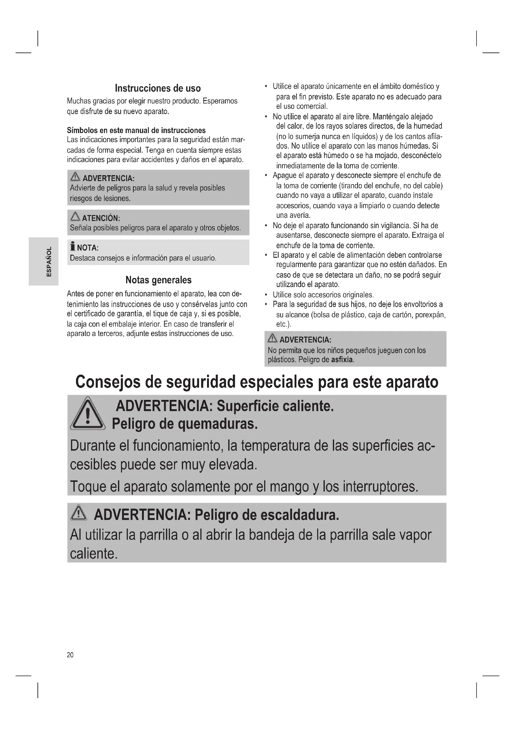- Para la seguridad de sus hijos, no deje los envoltorios a su alcance (bolsa de plástico, caja de cartón, porexpán, etc.). ADVERTENCIA: No permita que los niños pequeños jueguen con los plásticos. Peligro de asxia. Consejos de seguridad especiales para este aparato ADVERTENCIA: Supercie caliente. Peligro de quemaduras. Durante el funcionamiento, la temperatura de las supercies ac- cesibles puede ser muy elevada. Toque el aparato solamente por el mango y los interruptores. ADVERTENCIA: Peligro de escaldadura. Al utilizar la parrilla o al abrir la bandeja de la parrilla sale vapor caliente.21 ESPAÑOL ATENCIÓN: Peligro de incendio. Los aderezos con grasas y aceites pueden arder en caso de sobrecalentamiento. Mantenga una distancia de seguridad su- ciente (30 cm) con respecto a objetos inamables, tales como cortinas, mobiliario, etc.