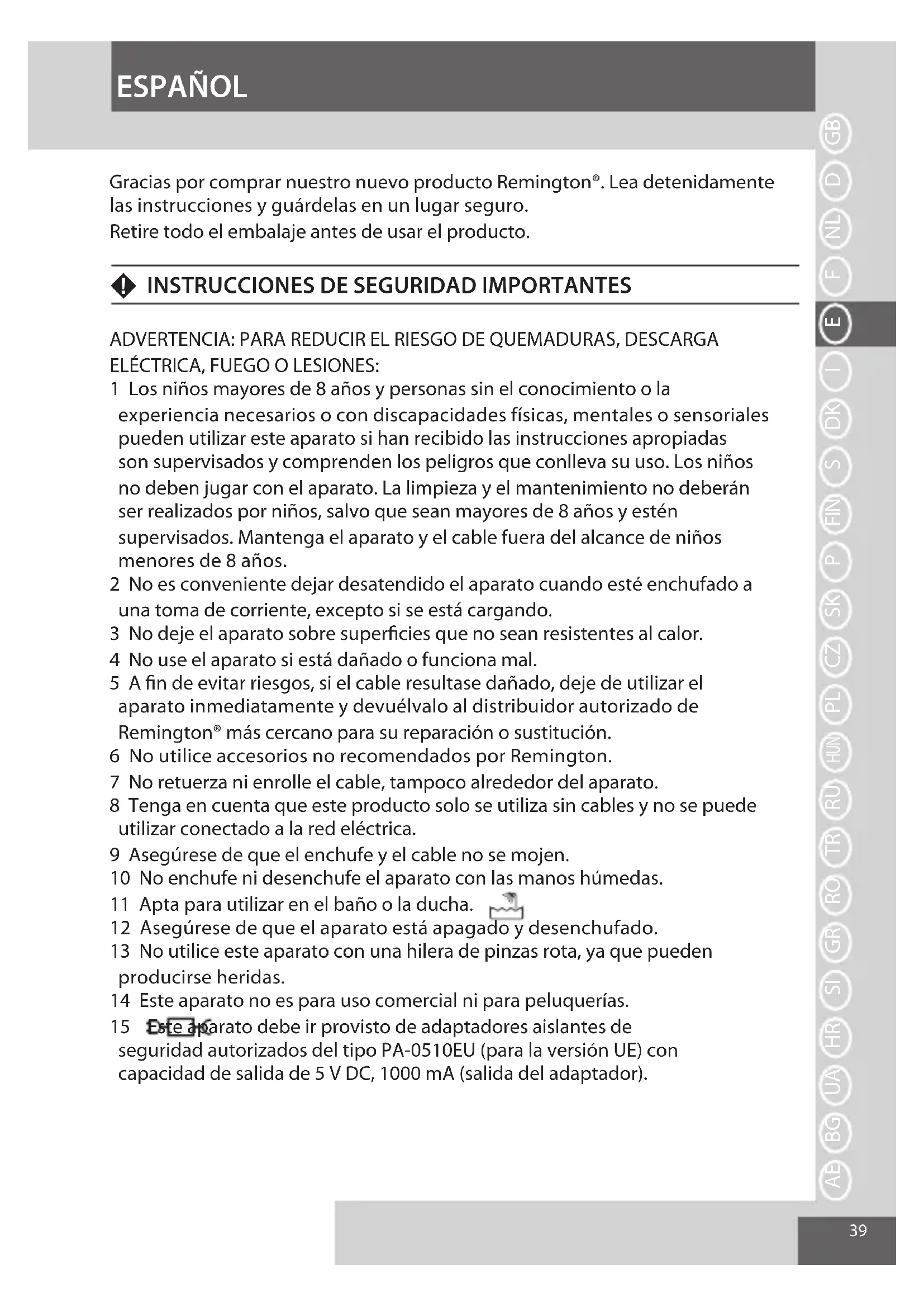 ADVERTENCIA: PARA REDUCIR EL RIESGO DE QUEMADURAS, DESCARGA ELÉCTRICA, FUEGO O LESIONES: 1 Los niños mayores de 8 años y personas sin el conocimiento o la experiencia necesarios o con discapacidades físicas, mentales o sensoriales pueden utilizar este aparato si han recibido las instrucciones apropiadas son supervisados y comprenden los peligros que conlleva su uso. Los niños no deben jugar con el aparato. La limpieza y el mantenimiento no deberán ser realizados por niños, salvo que sean mayores de 8 años y estén supervisados. Mantenga el aparato y el cable fuera del alcance de niños menores de 8 años. 2 No es conveniente dejar desatendido el aparato cuando esté enchufado a una toma de corriente, excepto si se está cargando. 3 No deje el aparato sobre superficies que no sean resistentes al calor. 4 No use el aparato si está dañado o funciona mal. 5 A fin de evitar riesgos, si el cable resultase dañado, deje de utilizar el aparato inmediatamente y devuélvalo al distribuidor autorizado de Remington® más cercano para su reparación o sustitución. 6 No utilice accesorios no recomendados por Remington. 7 No retuerza ni enrolle el cable, tampoco alrededor del aparato. 8 Tenga en cuenta que este producto solo se utiliza sin cables y no se puede utilizar conectado a la red eléctrica. 9 Asegúrese de que el enchufe y el cable no se mojen. 10 No enchufe ni desenchufe el aparato con las manos húmedas. 11 Apta para utilizar en el baño o la ducha. 12 Asegúrese de que el aparato está apagado y desenchufado. 13 No utilice este aparato con una hilera de pinzas rota, ya que pueden producirse heridas. 14 Este aparato no es para uso comercial ni para peluquerías. 15 Este aparato debe ir provisto de adaptadores aislantes de seguridad autorizados del tipo PA-0510EU (para la versión UE) con capacidad de salida de 5 V DC, 1000 mA (salida del adaptador). ESPAÑOL GBDNLFEIDKSFINPSKCZ HUN PLRUTRROGRSIBG HRUAAE40