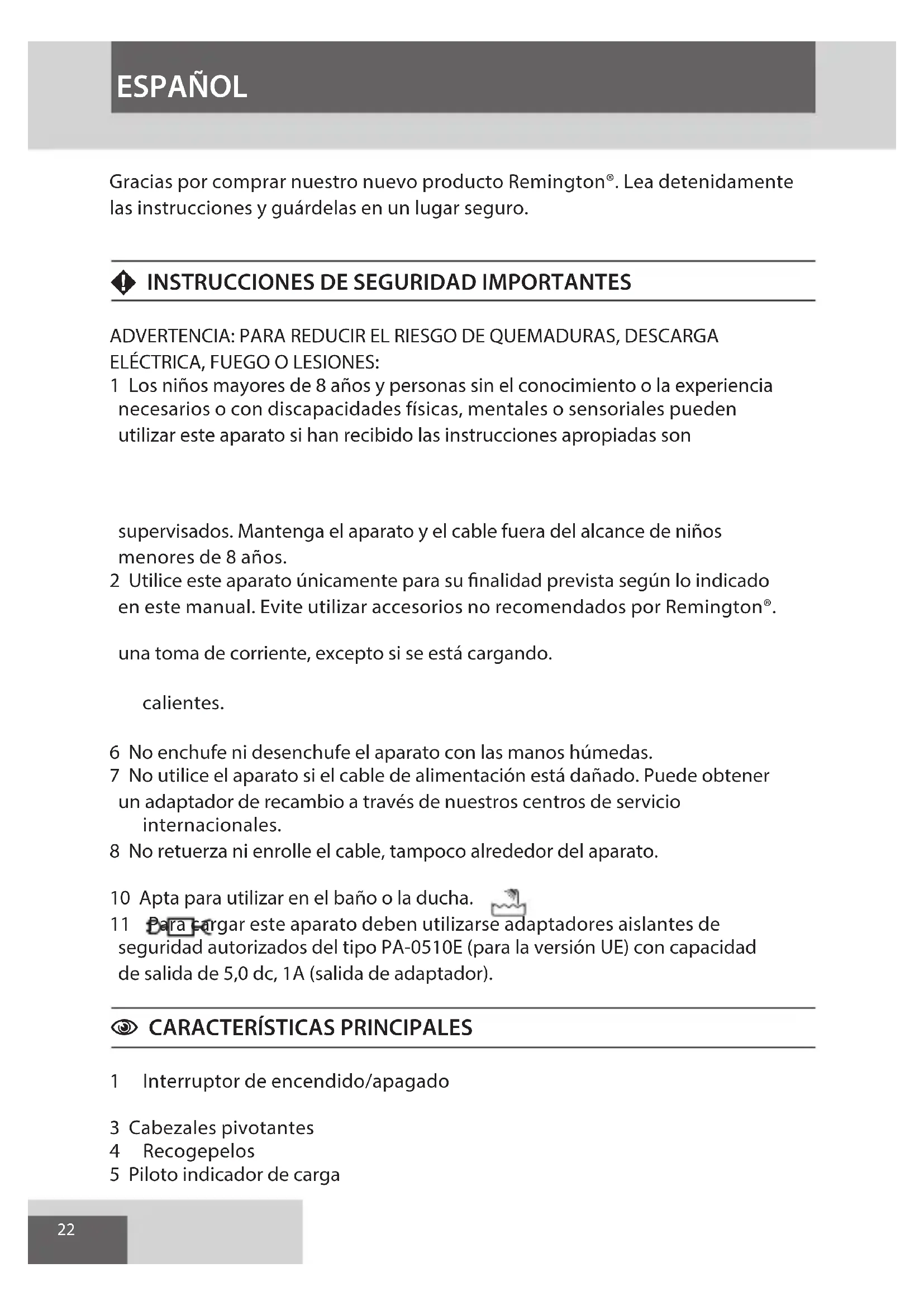 Gracias por comprar nuestro nuevo producto Remington. Lea detenidamente las instrucciones y guardelas en un lugar seguro.