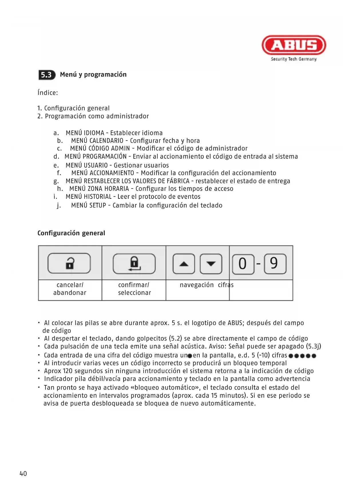 - Al colocar las pilas se abre durante aprox. 5 s. el logotipo de ABUS; después del campo de código