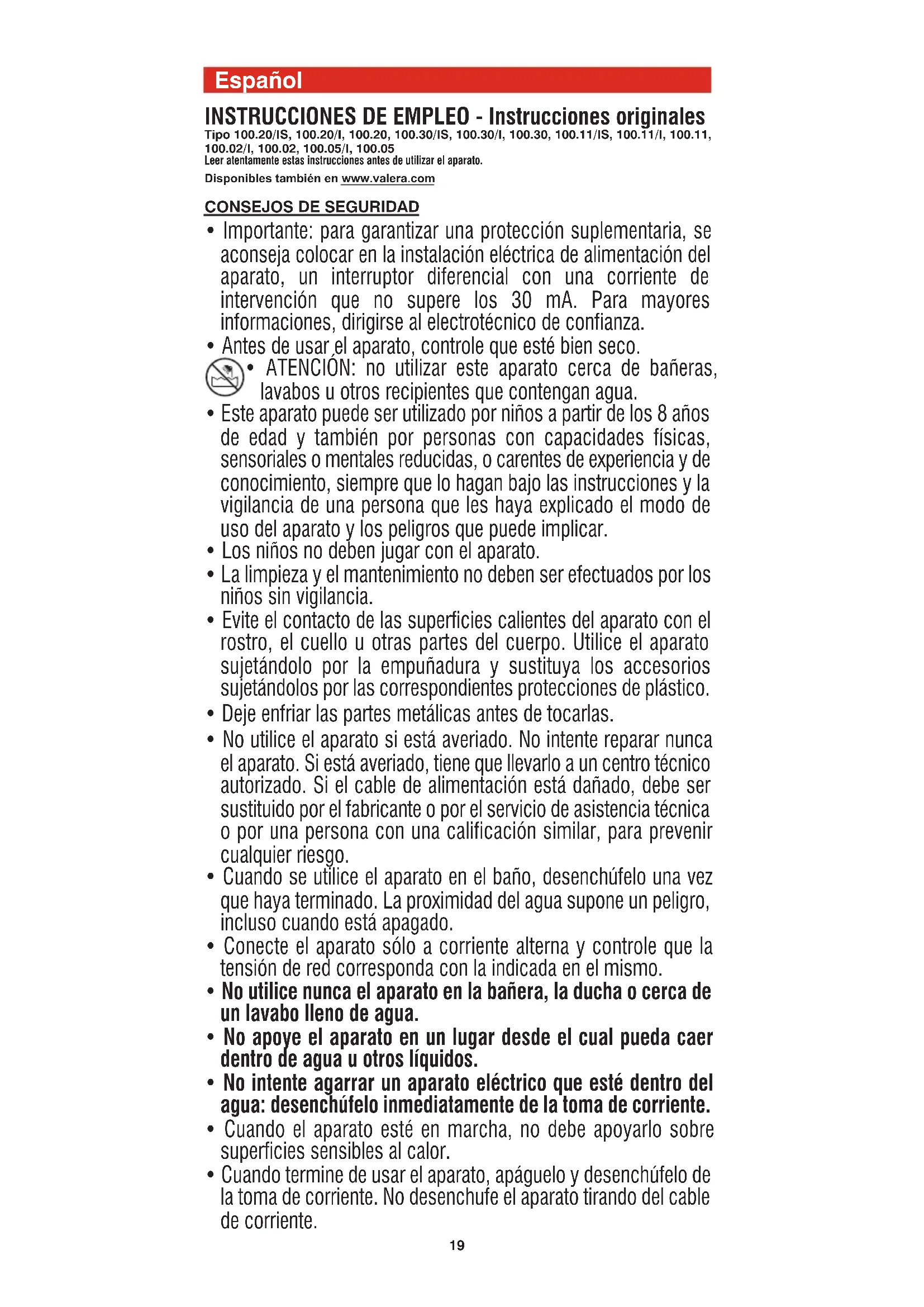 reparado por personas no autorizadas. En caso de avería, se debe entregar el aparato bien embalado y con el certificado de garantía regularmente fechado y sellado por el vendedor, a uno de nuestros Centros de Asistencia autorizados o al vendedor, quien se encargará de remitirlo al importador oficial para efectuar la reparación de la garantía. Como consumidor de este artículo, goza Vd. de los derechos que le reconoce la Ley de Garantías en la Venta de Bienes de Consumo 23/2003 (B.O.E. 11-07-03), en las condiciones que la misma establece. Recuerde que la fecha acreditada mediante el documento de compra, inicia el período de dos años previsto en la Ley. 00060714 int_mar2017:Layout 1 07/03/2017 9.20 Pagina 2122 Nederlands GEBRUIKSAANWIJZING - Oorspronkelijke gebruiksaanwijzing Type 100.20/IS, 100.20/I, 100.20, 100.30/IS, 100.30/I, 100.30, 100.11/IS, 100.11/I, 100.11, 100.02/I, 100.02, 100.05/I, 100.05 Lees deze aanwijzingen aandachtig door, voordat u het apparaat gebruikt. Ook beschikbaar op www.valera.com VEILIGHEIDSVOORSCHRIFTEN