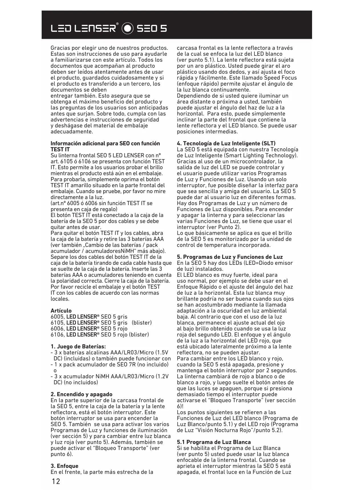 Gracias por elegir uno de nuestros productos. Estas son instrucciones de uso para ayudarle a familiarizarse con este artículo. Todos los documentos que acompañan al producto deben ser leídos atentamente antes de usar el producto, guardados cuidadosamente y si el producto es transferido a un tercero, los documentos se deben entregar también. Esto asegura que se obtenga el máximo beneficio del producto y las preguntas de los usuarios son anticipadas antes que surjan. Sobre todo, cumpla con las advertencias e instrucciones de seguridad y deshágase del material de embalaje adecuadamente. Información adicional para SEO con función TEST IT Su linterna frontal SEO 5 LED LENSER con nº art. 6105 ó 6106 se presenta con función TEST IT. Esto permite a los usuarios probar el brillo mientras el producto está aún en el embalaje. Para probarla, simplemente oprima el botón TEST IT amarillo situado en la parte frontal del embalaje. Cuando se pruebe, por favor no mire directamente a la luz. (art.nº 6005 ó 6006 sin función TEST IT se presenta en caja de regalo) El botón TEST IT está conectado a la caja de la batería de la SEO 5 por dos cables y se debe quitar antes de usar. Para quitar el botón TEST IT y los cables, abra la caja de la batería y retire las 3 baterías AAA (ver también „Cambio de las baterías / pack acumulador / acumuladoresNiMH“ más abajo). Separe los dos cables del botón TEST IT de la caja de la batería tirando de cada cable hasta que se suelte de la caja de la batería. Inserte las 3 baterías AAA o acumuladores teniendo en cuenta la polaridad correcta. Cierre la caja de la batería. Por favor recicle el embalaje y el botón TEST IT con los cables de acuerdo con las normas locales. Artículo 6005, LED LENSER® SEO 5 gris 6105, LED LENSER® SEO 5 gris (blister) 6006, LED LENSER® SEO 5 rojo 6106, LED LENSER® SEO 5 rojo (blister)