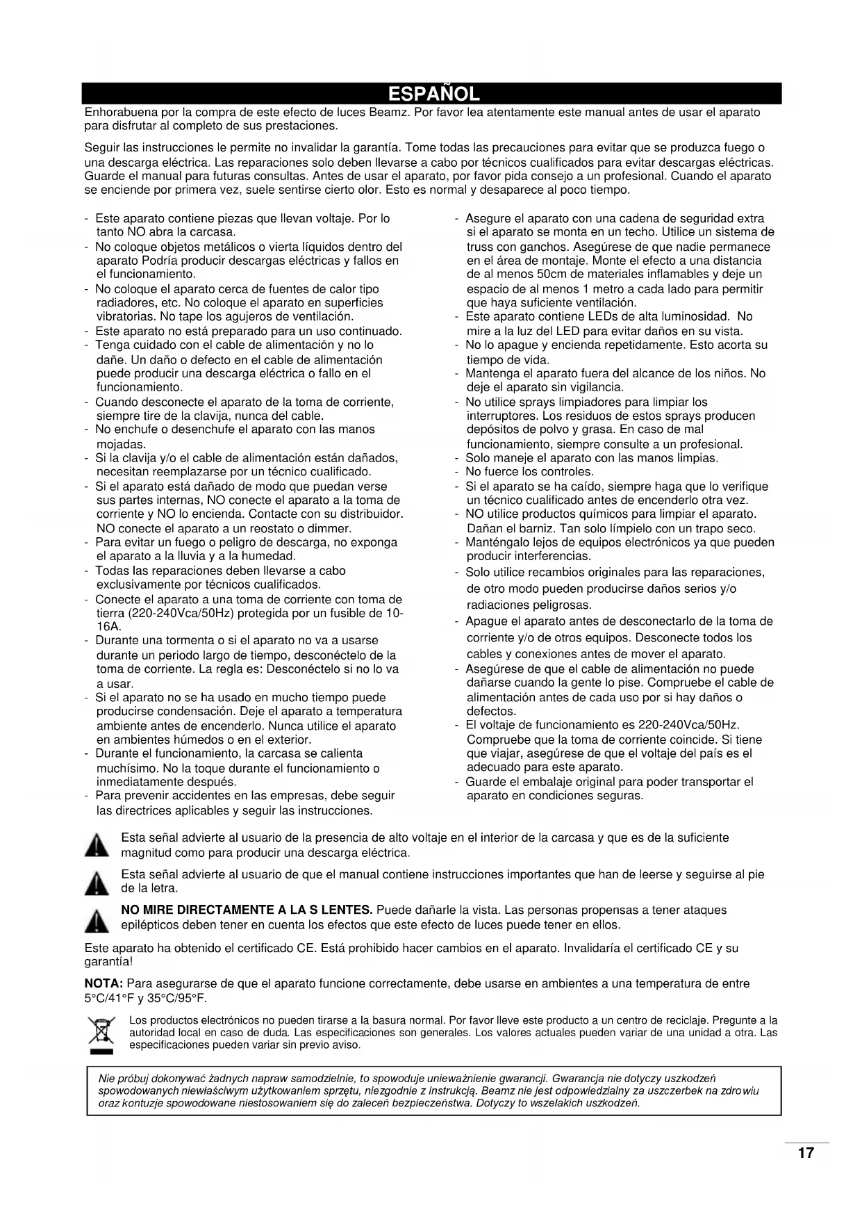 ACHTUNG: Wartungs- und Servicearbeiten sind ausschließlich dem autorisierten Fachhandel vorbehalten!17 ESPAÑOL Enhorabuena por la compra de este efecto de luces Beamz. Por favor lea atentamente este manual antes de usar el aparato para disfrutar al completo de sus prestaciones. Seguir las instrucciones le permite no invalidar la garantía. Tome todas las precauciones para evitar que se produzca fuego o una descarga eléctrica. Las reparaciones solo deben llevarse a cabo por técnicos cualificados para evitar descargas eléctricas. Guarde el manual para futuras consultas. Antes de usar el aparato, por favor pida consejo a un profesional. Cuando el aparato se enciende por primera vez, suele sentirse cierto olor. Esto es normal y desaparece al poco tiempo. - Este aparato contiene piezas que llevan voltaje. Por lo tanto NO abra la carcasa. - No coloque objetos metálicos o vierta líquidos dentro del aparato Podría producir descargas eléctricas y fallos en el funcionamiento. - No coloque el aparato cerca de fuentes de calor tipo radiadores, etc. No coloque el aparato en superficies vibratorias. No tape los agujeros de ventilación. - Este aparato no está preparado para un uso continuado. - Tenga cuidado con el cable de alimentación y no lo dañe. Un daño o defecto en el cable de alimentación puede producir una descarga eléctrica o fallo en el funcionamiento. - Cuando desconecte el aparato de la toma de corriente, siempre tire de la clavija, nunca del cable. - No enchufe o desenchufe el aparato con las manos mojadas. - Si la clavija y/o el cable de alimentación están dañados, necesitan reemplazarse por un técnico cualificado. - Si el aparato está dañado de modo que puedan verse sus partes internas, NO conecte el aparato a la toma de corriente y NO lo encienda. Contacte con su distribuidor. NO conecte el aparato a un reostato o dimmer. - Para evitar un fuego o peligro de descarga, no exponga el aparato a la lluvia y a la humedad. - Todas las reparaciones deben llevarse a cabo exclusivamente por técnicos cualificados. - Conecte el aparato a una toma de corriente con toma de tierra (220-240Vca/50Hz) protegida por un fusible de 10- 16A. - Durante una tormenta o si el aparato no va a usarse durante un periodo largo de tiempo, desconéctelo de la toma de corriente. La regla es: Desconéctelo si no lo va a usar. - Si el aparato no se ha usado en mucho tiempo puede producirse condensación. Deje el aparato a temperatura ambiente antes de encenderlo. Nunca utilice el aparato en ambientes húmedos o en el exterior. - Durante el funcionamiento, la carcasa se calienta muchísimo. No la toque durante el funcionamiento o inmediatamente después. - Para prevenir accidentes en las empresas, debe seguir las directrices aplicables y seguir las instrucciones. - Asegure el aparato con una cadena de seguridad extra si el aparato se monta en un techo. Utilice un sistema de truss con ganchos. Asegúrese de que nadie permanece en el área de montaje. Monte el efecto a una distancia de al menos 50cm de materiales inflamables y deje un espacio de al menos 1 metro a cada lado para permitir que haya suficiente ventilación. - Este aparato contiene LEDs de alta luminosidad. No mire a la luz del LED para evitar daños en su vista. - No lo apague y encienda repetidamente. Esto acorta su tiempo de vida. - Mantenga el aparato fuera del alcance de los niños. No deje el aparato sin vigilancia. - No utilice sprays limpiadores para limpiar los interruptores. Los residuos de estos sprays producen depósitos de polvo y grasa. En caso de mal funcionamiento, siempre consulte a un profesional. - Solo maneje el aparato con las manos limpias. - No fuerce los controles. - Si el aparato se ha caído, siempre haga que lo verifique un técnico cualificado antes de encenderlo otra vez. - NO utilice productos químicos para limpiar el aparato. Dañan el barniz. Tan solo límpielo con un trapo seco. - Manténgalo lejos de equipos electrónicos ya que pueden producir interferencias. - Solo utilice recambios originales para las reparaciones, de otro modo pueden producirse daños serios y/o radiaciones peligrosas. - Apague el aparato antes de desconectarlo de la toma de corriente y/o de otros equipos. Desconecte todos los cables y conexiones antes de mover el aparato. - Asegúrese de que el cable de alimentación no puede dañarse cuando la gente lo pise. Compruebe el cable de alimentación antes de cada uso por si hay daños o defectos. - El voltaje de funcionamiento es 220-240Vca/50Hz. Compruebe que la toma de corriente coincide. Si tiene que viajar, asegúrese de que el voltaje del país es el adecuado para este aparato. - Guarde el embalaje original para poder transportar el aparato en condiciones seguras. Esta señal advierte al usuario de la presencia de alto voltaje en el interior de la carcasa y que es de la suficiente magnitud como para producir una descarga eléctrica. Esta señal advierte al usuario de que el manual contiene instrucciones importantes que han de leerse y seguirse al pie de la letra. NO MIRE DIRECTAMENTE A LA S LENTES. Puede dañarle la vista. Las personas propensas a tener ataques epilépticos deben tener en cuenta los efectos que este efecto de luces puede tener en ellos. Este aparato ha obtenido el certificado CE. Está prohibido hacer cambios en el aparato. Invalidaría el certificado CE y su garantía! NOTA: Para asegurarse de que el aparato funcione correctamente, debe usarse en ambientes a una temperatura de entre 5°C/41°F y 35°C/95°F. Los productos electrónicos no pueden tirarse a la basura normal. Por favor lleve este producto a un centro de reciclaje. Pregunte a la autoridad local en caso de duda. Las especificaciones son generales. Los valores actuales pueden variar de una unidad a otra. Las especificaciones pueden variar sin previo aviso. Nie próbuj dokonywać żadnych napraw samodzielnie, to spowoduje unieważnienie gwarancji. Gwarancja nie dotyczy uszkodzeń spowodowanych niewłaści