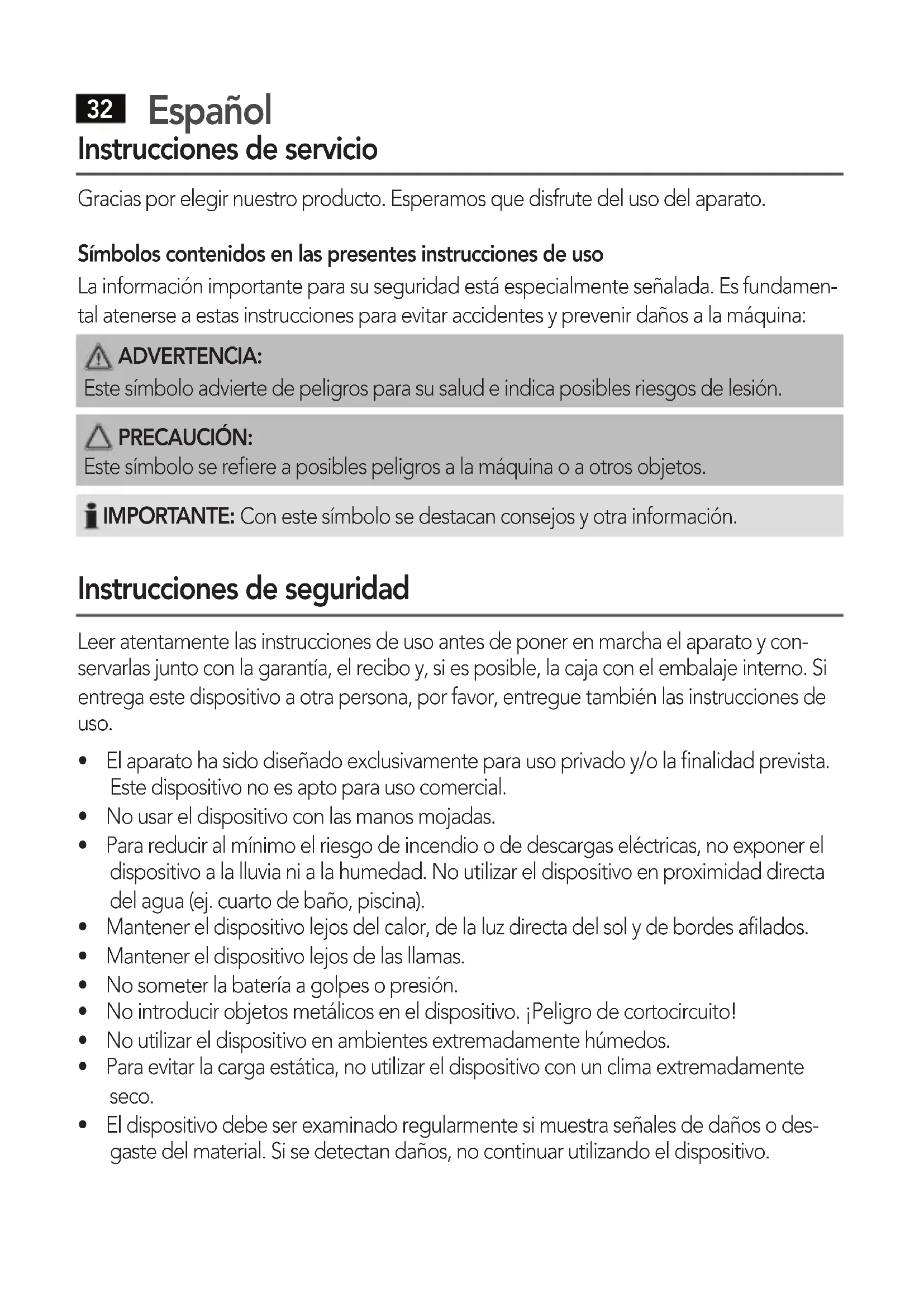 Instrucciones de servicio Gracias por elegir nuestro producto. Esperamos que disfrute del uso del aparato. Símbolos contenidos en las presentes instrucciones de uso La información importante para su seguridad está especialmente señalada. Es fundamen- tal atenerse a estas instrucciones para evitar accidentes y prevenir daños a la máquina: ADVERTENCIA: Este símbolo advierte de peligros para su salud e indica posibles riesgos de lesión. PRECAUCIÓN: Este símbolo se refiere a posibles peligros a la máquina o a otros objetos. IMPORTANTE: Con este símbolo se destacan consejos y otra información. Instrucciones de seguridad Leer atentamente las instrucciones de uso antes de poner en marcha el aparato y con- servarlas junto con la garantía, el recibo y, si es posible, la caja con el embalaje interno. Si entrega este dispositivo a otra persona, por favor, entregue también las instrucciones de uso.