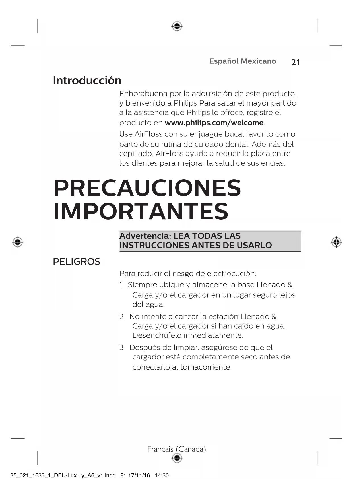 English 4235_021_1633_1_DFU-Luxury_A6_v1.indd 20 17/11/16 14:30Français (Canada) Introducción Enhorabuena por la adquisición de este producto, y bienvenido a Philips Para sacar el mayor partido a la asistencia que Philips le ofrece, registre el producto en www.philips.com/welcome. Use AirFloss con su enjuague bucal favorito como parte de su rutina de cuidado dental. Además del cepillado, AirFloss ayuda a reducir la placa entre los dientes para mejorar la salud de sus encías. PRECAUCIONES IMPORTANTES Advertencia: LEA TODAS LAS