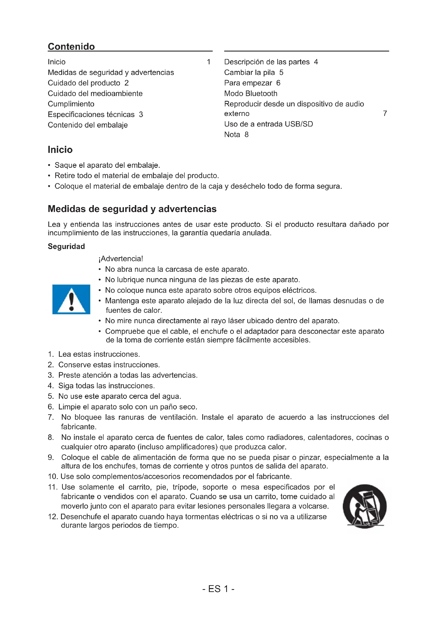 LE ROGAMOS QUE LEA ÍNTEGRAMENTE EL PRESENTE MANUAL DEL USUARIO ANTES DE UTILIZAR EL EQUIPO Y QUE CONSERVE ESTE FOLLETO PARA PODER CONSULTARLO EN EL FUTURO. ES- ES 1 - Contenido Inicio 1 Medidas de seguridad y advertencias Cuidado del producto 2 Cuidado del medioambiente Cumplimiento Especicaciones técnicas 3 Contenido del embalaje Descripción de las partes 4 Cambiar la pila 5 Para empezar 6 Modo Bluetooth Reproducir desde un dispositivo de audio externo 7 Uso de a entrada USB/SD Nota 8 Inicio