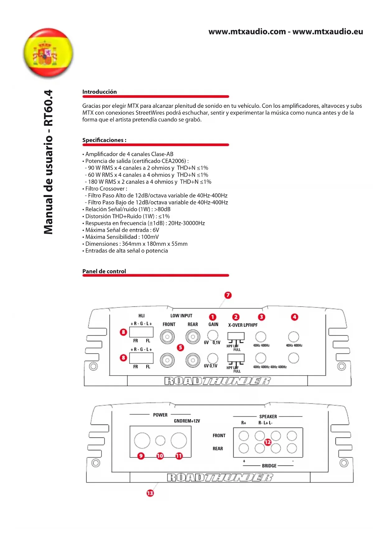 - En posición "Full" desactivará dicho ltro. Control de Frecuencia Paso Alto (HPF) : Use este ajuste para seleccionar la frecuencia de corte del ltro Crossover Paso Alto desde 40Hz a 400Hz. Control de Frecuencia Paso bajo (LPF) : Use este ajuste para seleccionar la frecuencia de corte del ltro Crossover Paso Alto desde 40Hz a 400Hz. Entradas RCA (LOW INPUT) : Estas entradas se usarán cuando la salida del auto-radio disponga de salidas RCA o salidas de línea de voltaje mínimo de 100mV. MTX recomienda solo cables de alta calidad apantallados para reducir la posibilidad de intrusión de ruidos. LED PowerOn/Protection: El LED se iluminará en rojo cuando se encienda la unidad. Cuando este LED parpadee indicará cortocircuito o sobrecarga térmica. Entradas de señal de alta o altavoz (HLI) : Estas entradas se conectarán a las salidas de altavoz del auto-radio mediante cableado directo. Nota: Cuando se utilicen las entradas de alta, se precisará de un cable de remoto para encender y apagar el amplificador. Terminal Power (+12V) : Esta es la entrada principal de alimentación positiva, la cual se debe conectar directa- mente al terminal positivo de la batería. Evite pasar el cable de alimentación junto a cableado RCA para evitar la intrusión de ruido. Es muy importante que asegure bien las conexiones para unas máximas prestaciones. MTX recomienda el uso de cable mínimo de 10mm2 para el RT60.4. Terminal Remoto (REM) : Aplicando un voltaje de +12V a este terminal, la etapa se encenderá. Normalmente el autoradio dispone de una salida de remote marcada como “remote” o “power antena”. Terminal de masa (GND) : Se precisa de una buena conexión de masa o negativo para un correcto fucnciona- miento. Utilice el mismo diametro de cable que con el positivo. Conectelo a algún punto del chasis del vehículo, el cual habra lijado para retirar la pintura y limpiado de suciedad. Ha de garantizar una buena conductividad. Terminales de altavoz (SPEAKER) : Conecte los altavoces a estos terminales. Es muy importante que la polaridad de los mismos y la de los terminales de conexión para evitar perdida en graves. Modo Puente : Cuando use este modo es muy importante que conecte use solo el terminal positivo de un canal y el negativo del otro. Fusible (FUSE) : Cuando se fundan fusibles reemplacelos por otros del mismo valor de corriente que el reempla- zado, nunca de valores superiores. Precaución : los fusibles están situados bajo el ma’s ampplierwww.mtxaudio.com - www.mtxaudio.eu Instalación y montaje MTX recomienda que un instalador autorizado de MTX haga la instalación de tu amplicador RoadTHUNDER. Cualquier variación de las especicaciones recomendadas en la conexión del amplicador podría dañar seria- mente el amplicador, altavoces y/o el sistema eléctrico del vehículo. Por favor verica dos veces las conexiones antes de encender el sistema.