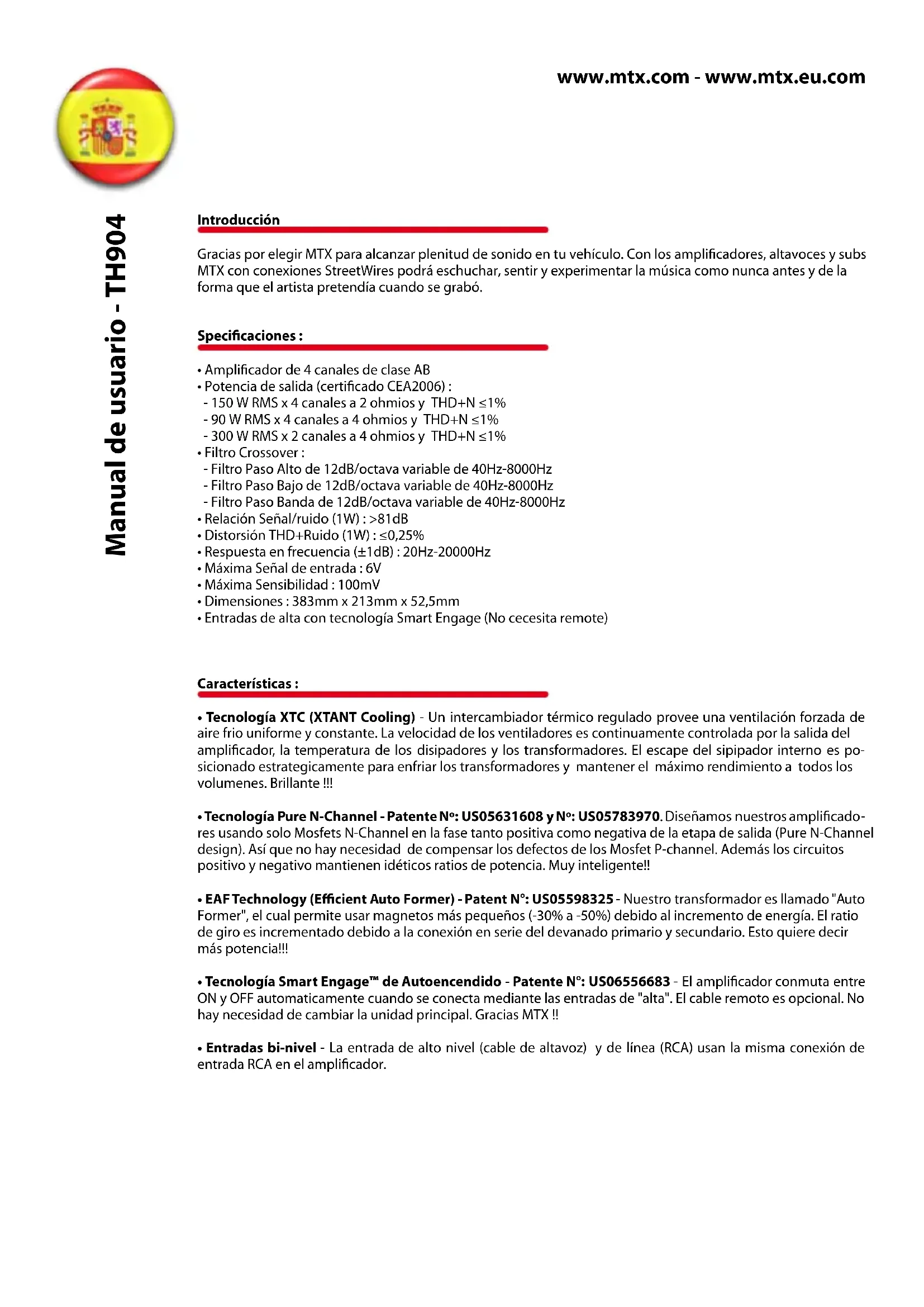 - Tecnología Smart Engage™ de Autoencendido - Patente N°: US06556683 - El amplicador conmuta entre ON y OFF automaticamente cuando se conecta mediante las entradas de "alta". El cable remoto es opcional. No hay necesidad de cambiar la unidad principal. Gracias MTX !!