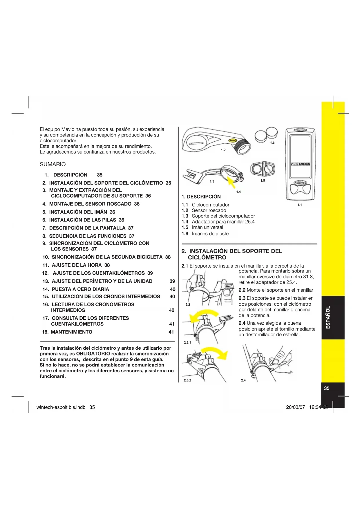 wintech-esbolt bis.indb 36wintech-esbolt bis.indb 36 20/03/07 12:34:3620/03/07 12:34:36 Cyan quadriMagenta quadriJaune quadriNoir quadri37 ESPAÑOL la puesta a cero de los siguientes parámetros : kilometraje total, unidad de medida (M o KM), perímetro de la rueda, hora. Tras la instalación o sustitución de una de las pilas (de los sensores o del ciclómetro), es obligatorio realizar de nuevo la operación de sincronización descrita en el punto 9 de esta guía. Vida útil de las pilas: de 12 a 24 meses, dependiendo del uso.