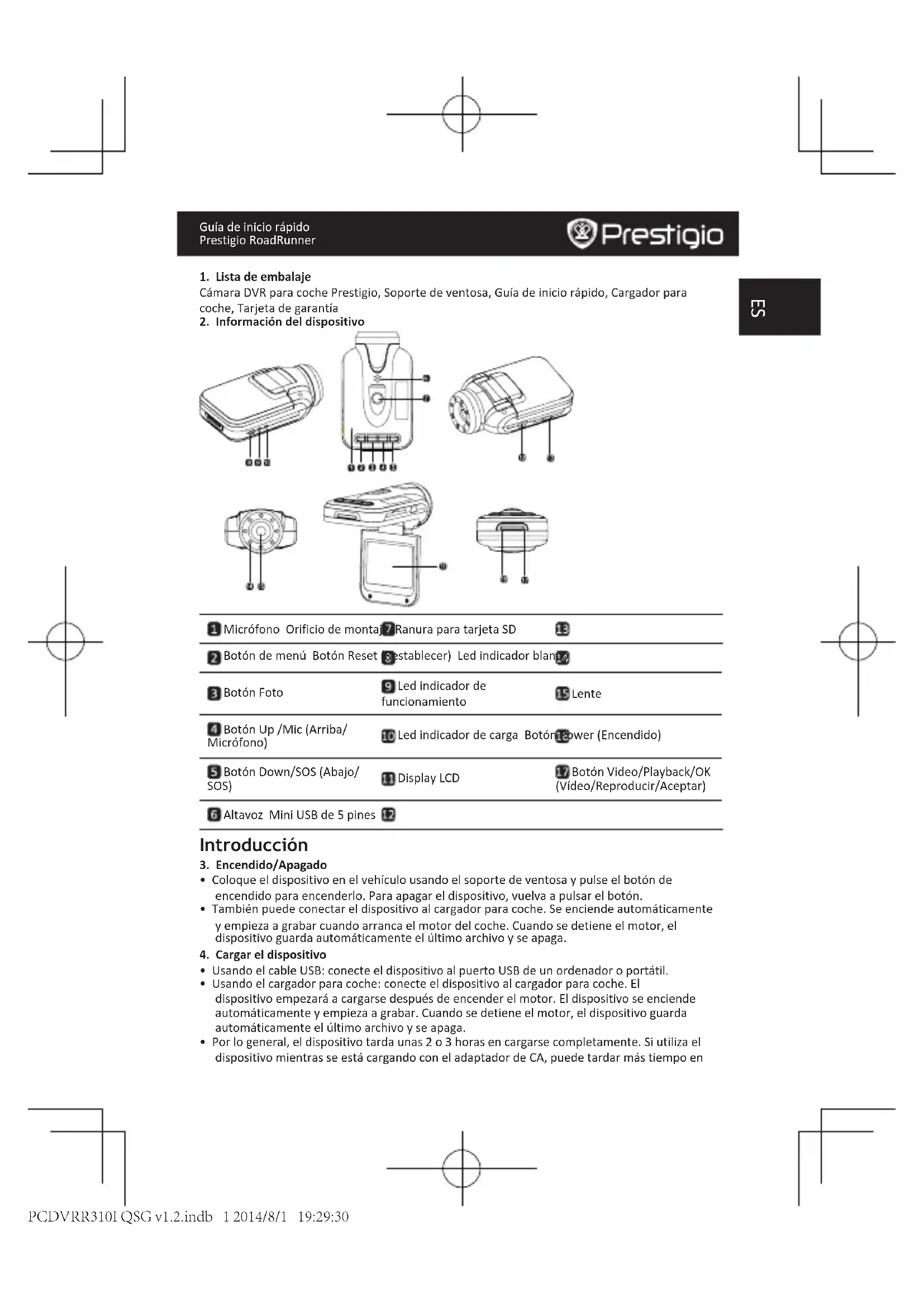 - Por lo general, el dispositivo tarda unas 2 o 3 horas en cargarse completamente. Si utiliza el dispositivo mientras se está cargando con el adaptador de CA, puede tardar más tiempo en PCDVRR310I QSG v1.2.indb 1 2014/8/1 19:29:30Guía de inicio rápido Prestigio RoadRunner